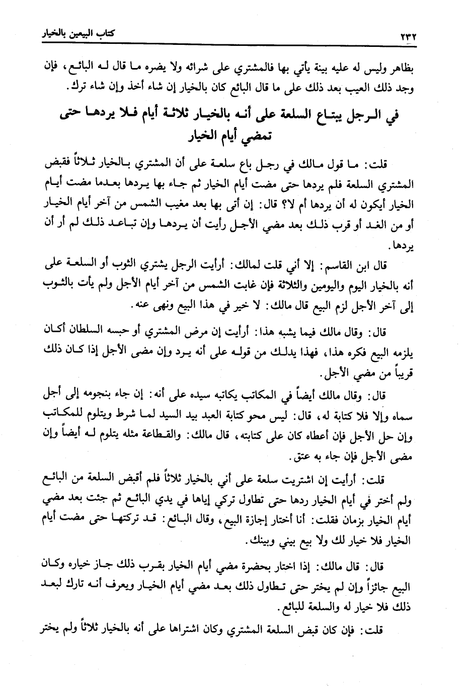 فِي الرَّجُلِ يَبْتَاعُ السِّلْعَةَ عَلَى أَنَّهُ بِالْخِيَارِ ثَلَاثَةَ أَيَّام فَلَا يَرُدُّهَا حَتَّى تَمْضِيَ أَيَّامُ الْخِيَارِ قُلْتُ: مَا قَوْلُ مَالِكٍ فِي رَجُلٍ بَاعَ سِلْعَةً عَلَى أَنَّ الْمُشْتَرِيَ بِالْخِيَارِ ثَلَاثًا فَقَبَضَ الْمُشْتَرِي السِّلْعَةَ فَلَمْ يَرُدَّهَا حَتَّى مَضَتْ أَيَّامُ الْخِيَارِ ثُمَّ جَاءَ بِهَا يَرُدُّهَا بَعْدَ مَا مَضَتْ أَيَّامُ الْخِيَارِ أَيَكُونُ لَهُ أَنْ يَرُدَّهَا أَمْ لَا؟ قَالَ: إنْ أَتَى بَعْدَ مَغِيبِ الشَّمْسِ مِنْ آخِرِ أَيَّامِ الْخِيَارِ أَوْ مِنْ الْغَدِ أَوْ قُرْبَ ذَلِكَ بَعْدَ مُضِيِّ الْأَجَلِ رَأَيْتُ أَنْ يَرُدَّهَا وَإِنْ تَبَاعَدَ ذَلِكَ لَمْ أَرَ أَنْ يَرُدَّهَا قَالَ ابْنُ الْقَاسِمِ: إلَّا أَنِّي قُلْتُ لِمَالِكٍ: أَرَأَيْت الرَّجُلَ يَشْتَرِي الثَّوْبَ أَوْ السِّلْعَةَ عَلَى أَنَّهُ بِالْخِيَارِ الْيَوْمَ وَالْيَوْمَيْنِ وَالثَّلَاثَةَ فَإِنْ غَابَتْ الشَّمْسُ مِنْ آخِرِ أَيَّامِ الْأَجَلِ وَلَمْ يَأْتِ بِالثَّوْبِ إلَى آخِرِ الْأَجَلِ لَزِمَ الْبَيْعُ قَالَ مَالِكٌ: لَا خَيْرَ فِي هَذَا الْبَيْعِ وَنَهَى عَنْهُ.