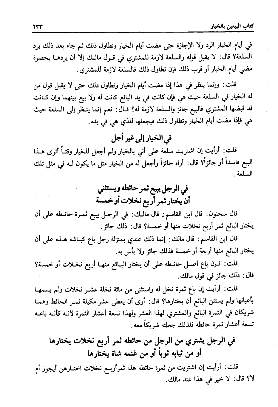فِي الرَّجُلِ يَشْتَرِي مِنْ الرَّجُلِ مِنْ حَائِطِهِ ثَمَرَ أَرْبَعِ نَخَلَاتٍ يَخْتَارُهَا أَوْ مِنْ ثِيَابِهِ ثَوْبًا أَوْ مِنْ غَنَمِهِ شَاةً يَخْتَارُهَا قُلْتُ: أَرَأَيْتَ إنْ اشْتَرَيْت مَنْ ثَمَرَةِ حَائِطِهِ هَذَا ثَمَرَ أَرْبَعِ نَخَلَاتٍ اخْتَارَهُنَّ أَيَجُوزُ أَمْ لَا؟ قَالَ: لَا خَيْرَ فِي هَذَا عِنْدَ مَالِكٍ.