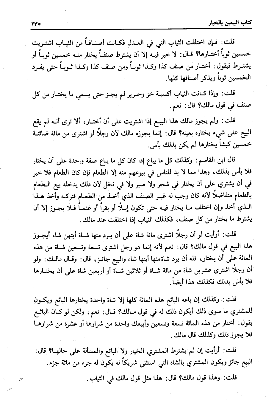 قَالَ ابْنُ الْقَاسِمِ: وَكَذَلِكَ كُلُّ مَا يُبَاعُ إذَا كَانَ كُلُّ مَا يُبَاعُ صِفَةً وَاحِدَةً عَلَى أَنْ يَخْتَارَ فَلَا بَأْسَ بِذَلِكَ، وَهَذَا مِمَّا لَا بُدَّ لِلنَّاسِ فِي بُيُوعِهِمْ مِنْهُ إلَّا الطَّعَامَ فَإِنْ كَانَ الطَّعَامُ فَلَا خَيْرَ فِي أَنْ يَشْتَرِيَ عَلَى أَنْ يَخْتَارَ فِي شَجَرٍ وَلَا صُبُرٍ وَلَا فِي نَخْلٍ لِأَنَّ ذَلِكَ يَدْخُلُهُ بَيْعُ الطَّعَامِ بِالطَّعَامِ مُتَفَاضِلًا لِأَنَّهُ كَانَ وَجَبَ لَهُ غَيْرُ الصِّنْفِ الَّذِي أَخَذَ مِنْ الطَّعَامِ فَتَرَكَهُ وَأَخَذَ هَذَا الَّذِي أَخَذَ وَإِنْ اخْتَلَفَ مَا يَخْتَارُ فِيهِ حَتَّى تَكُونَ إبِلًا أَوْ بَقَرًا أَوْ غَنَمًا فَلَا يَجُوزُ إلَّا أَنْ يَشْتَرِطَ مَا يَخْتَارُ مِنْ كُلِّ صِنْفٍ، فَكَذَلِكَ الثِّيَابُ إذَا اخْتَلَفَتْ عِنْدَ مَالِكٍ.