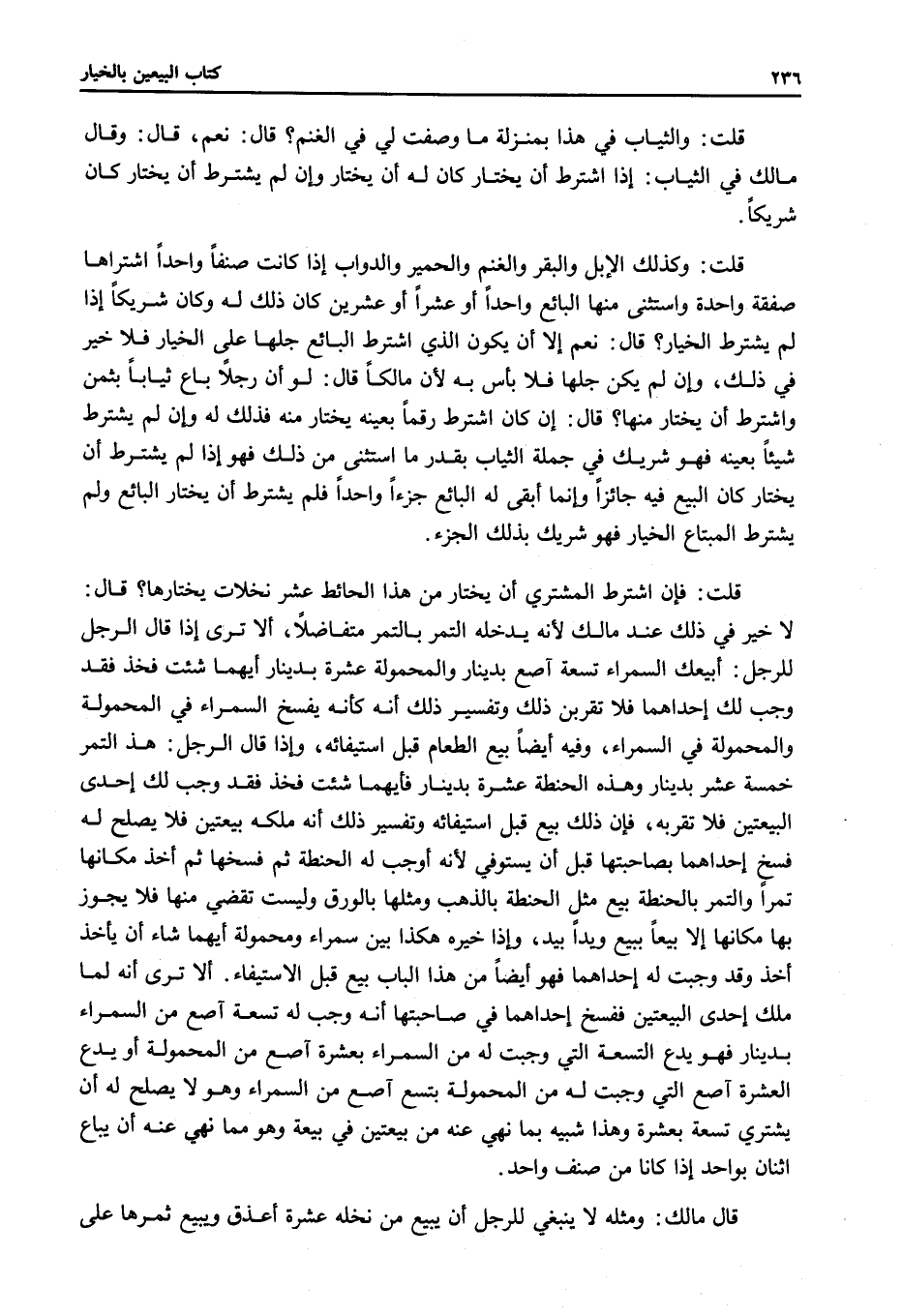 قَالَ: وَقَالَ مَالِكٌ فِي الثِّيَابِ: إذَا اشْتَرَطَ أَنْ يَخْتَارَ كَانَ لَهُ أَنْ يَخْتَارَ وَإِنْ لَمْ يَشْتَرِطْ أَنْ يَخْتَارَ كَانَ شَرِيكًا.