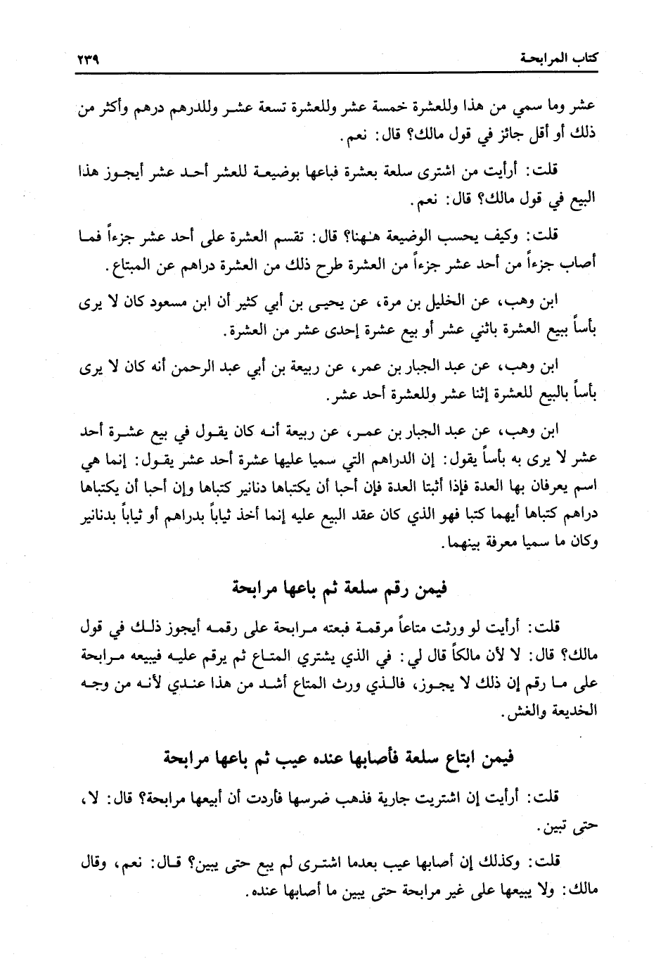 فِيمَنْ رَقَّمَ سِلْعَةً ثُمَّ بَاعَهَا مُرَابَحَةً قُلْتُ: أَرَأَيْتَ لَوْ وَرِثْتُ مَتَاعًا مُرَقَّمَةً فَبِعْتُهُ مُرَابَحَةً عَلَى رَقْمِهِ أَيَجُوزُ ذَلِكَ فِي قَوْلِ مَالِكٍ؟