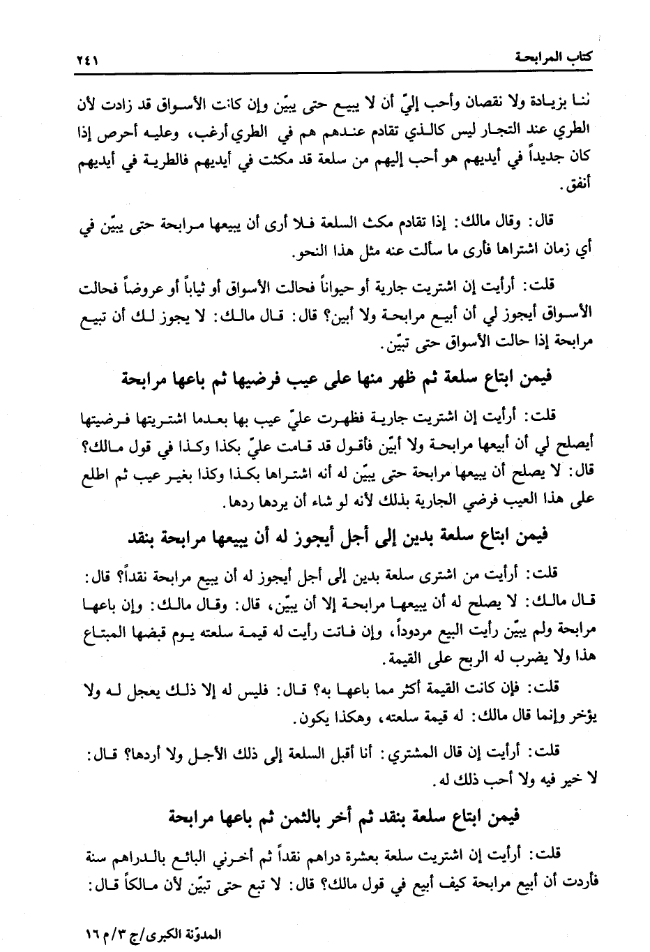 فِيمَنْ ابْتَاعَ سِلْعَةً بِدَيْنٍ إلَى أَجَلٍ أَيَجُوزُ لَهُ أَنْ يَبِيعَهَا مُرَابَحَةً بِنَقْدٍ قُلْتُ: أَرَأَيْتَ مَنْ اشْتَرَى سِلْعَةً بِدَيْنٍ إلَى أَجَلٍ أَيَجُوزُ لَهُ أَنْ يَبِيعَ مُرَابَحَةً نَقْدًا؟ قَالَ: قَالَ مَالِكٌ: لَا يَصْلُحُ لَهُ أَنْ يَبِيعَهَا مُرَابَحَةً إلَّا أَنْ يُبَيِّنَ.
