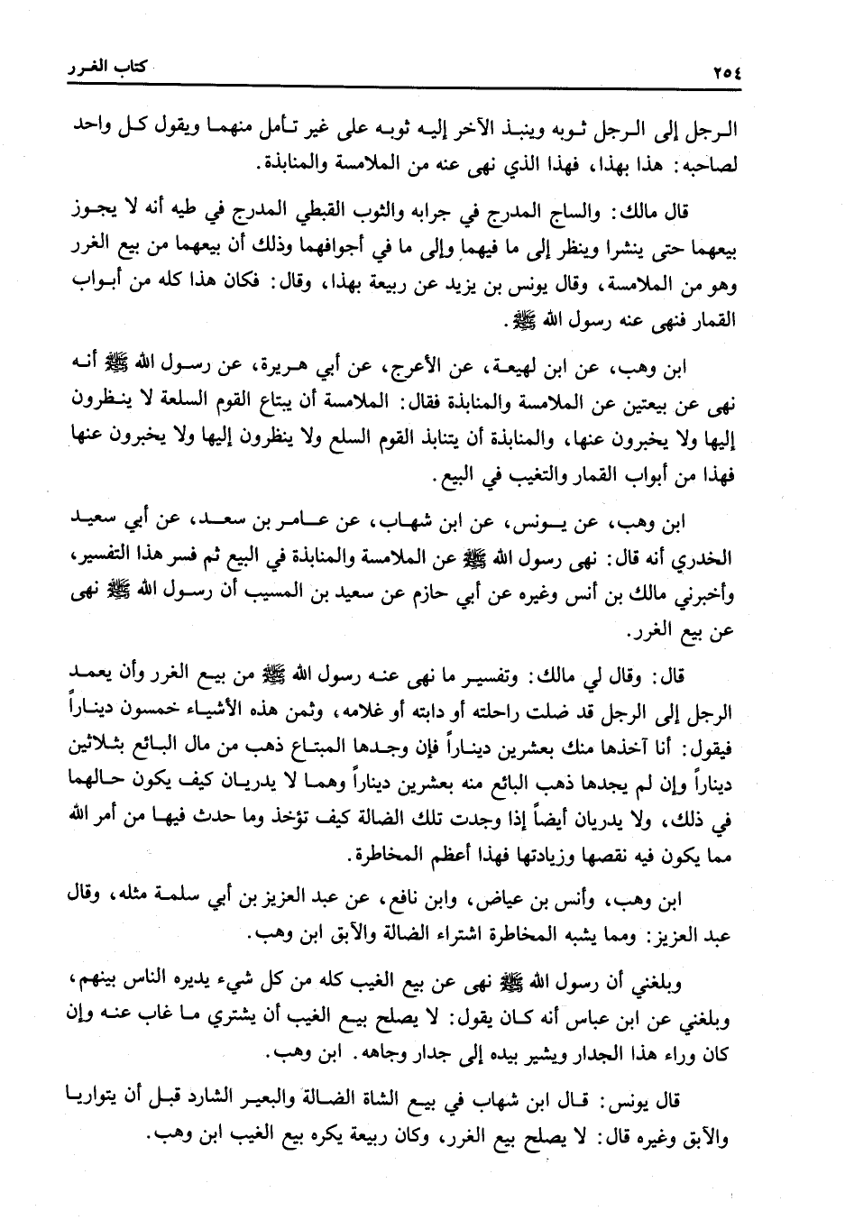 ابْنُ وَهْبٍ، عَنْ ابْنِ لَهِيعَةَ، عَنْ الْأَعْرَجِ، عَنْ أَبِي هُرَيْرَةَ، عَنْ رَسُولِ اللَّهِ - صَلَّى اللَّهُ عَلَيْهِ وَسَلَّمَ - «أَنَّهُ نَهَى عَنْ بَيْعَتَيْنِ عَنْ الْمُلَامَسَةِ وَالْمُنَابَذَةِ» فَقَالَ: الْمُلَامَسَةُ أَنْ يَبْتَاعَ الْقَوْمُ السِّلْعَةَ لَا يَنْظُرُونَ إلَيْهَا وَلَا يُخْبِرُونَ عَنْهَا، وَالْمُنَابَذَةُ أَنْ يَتَنَابَذَ الْقَوْمُ السِّلَعَ وَلَا يَنْظُرُونَ إلَيْهَا وَلَا يُخْبِرُونَ عَنْهَا فَهَذَا مِنْ أَبْوَابِ الْقِمَارِ وَالتَّغَيُّبِ فِي الْبَيْعِ. ابْنُ وَهْبٍ، عَنْ يُونُسَ، عَنْ ابْنِ شِهَابٍ، عَنْ عَامِرِ بْنِ سَعْدٍ، عَنْ أَبِي سَعِيدٍ الْخُدْرِيِّ أَنَّهُ قَالَ: «نَهَى رَسُولُ اللَّهِ - صَلَّى اللَّهُ عَلَيْهِ وَسَلَّمَ - عَنْ الْمُلَامَسَةِ وَالْمُنَابَذَةِ فِي الْبَيْعِ» ثُمَّ فَسَّرَ هَذَا التَّفْسِيرَ، وَأَخْبَرَنِي مَالِكُ بْنُ أَنَسٍ وَغَيْرُهُ عَنْ أَبِي حَازِمٍ عَنْ سَعِيدِ بْنِ الْمُسَيِّبِ أَنَّ رَسُولَ اللَّهِ - صَلَّى اللَّهُ عَلَيْهِ وَسَلَّمَ - «نَهَى عَنْ بَيْعِ الْغَرَرِ» .