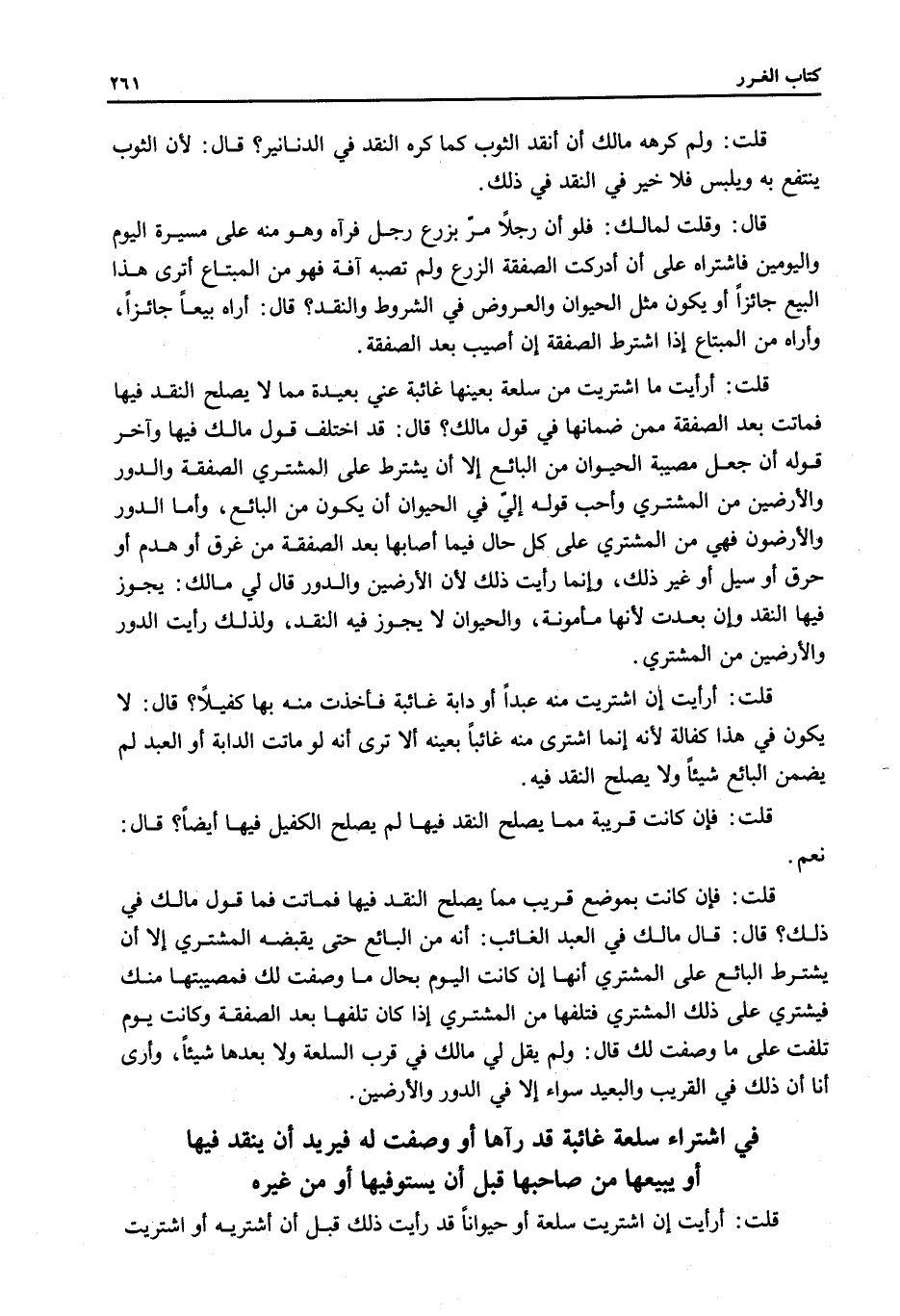 قَالَ: وَقُلْتُ لِمَالِكٍ: فَلَوْ أَنَّ رَجُلًا مَرَّ بِزَرْعِ رَجُلٍ فَرَآهُ وَهُوَ مِنْهُ عَلَى مَسِيرَةِ الْيَوْمِ وَالْيَوْمَيْنِ فَاشْتَرَاهُ عَلَى أَنْ أَدْرَكَتْ الصَّفْقَةُ الزَّرْعَ وَلَمْ تُصِبْهُ آفَةٌ فَهُوَ مَنْ الْمُبْتَاعِ أَتُرَى هَذَا الْبَيْعَ جَائِزًا أَوْ يَكُونُ مِثْلَ الْحَيَوَانِ وَالْعُرُوضِ فِي الشُّرُوطِ وَالنَّقْدِ؟