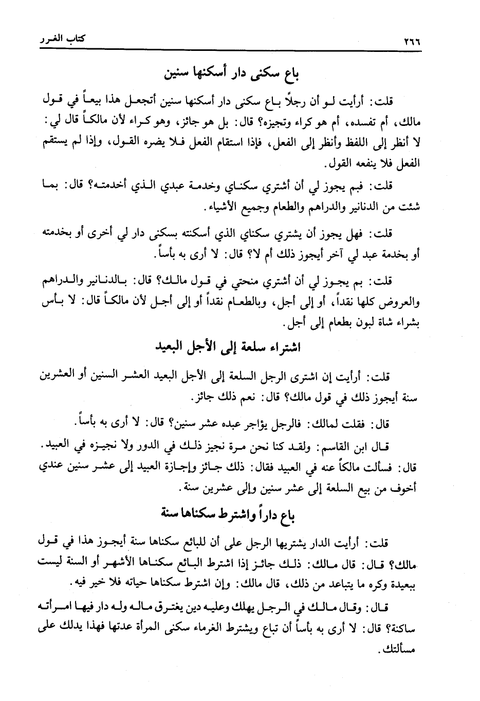 َ قُلْتُ: أَرَأَيْتَ لَوْ أَنَّ رَجُلًا بَاعَ سُكْنَى دَارٍ أَسْكَنَهَا سِنِينَ أَتَجْعَلُ هَذَا بَيْعًا فِي قَوْلِ مَالِكٍ، أَمْ تُفْسِدُهُ، أَمْ هُوَ كِرَاءٌ وَتُجِيزُهُ؟