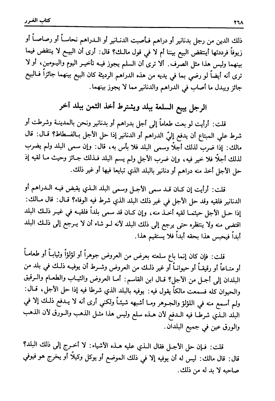 الرَّجُلُ يَبِيعُ السِّلْعَةَ بِبَلَدٍ وَيَشْتَرِطُ أَخْذَ الثَّمَنِ بِبَلَدٍ آخَرَ قُلْتُ: أَرَأَيْتَ لَوْ بِعْتُ طَعَامًا إلَى أَجَلٍ بِدَرَاهِمَ أَوْ بِدَنَانِيرَ وَنَحْنُ بِالْمَدِينَةِ وَشَرَطْت أَوْ شَرَطَ عَلَى الْمُبْتَاعُ أَنْ يَدْفَعَ إلَيَّ الدَّرَاهِمَ أَوْ الدَّنَانِيرَ إذَا حَلَّ الْأَجَلُ بِالْفُسْطَاطِ؟ .