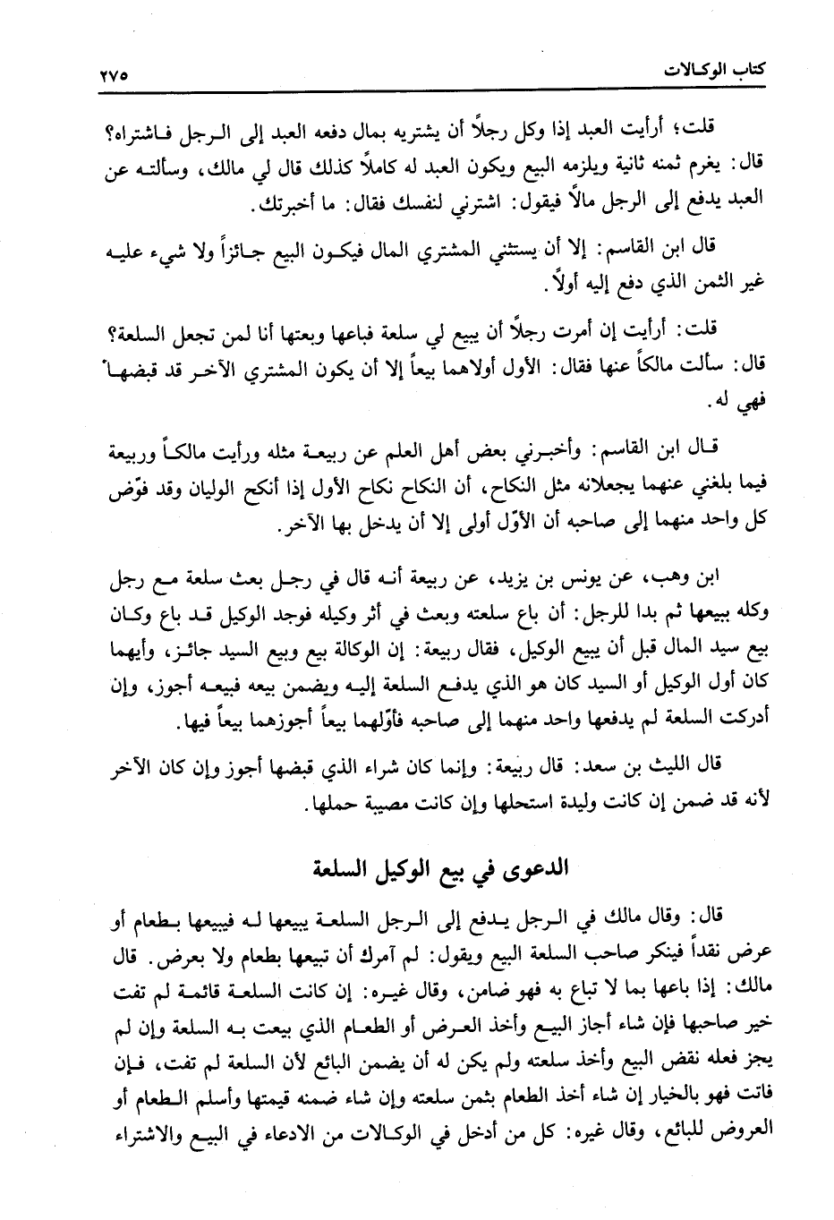 قَالَ ابْنُ الْقَاسِمِ: وَأَخْبَرَنِي بَعْضُ أَهْلِ الْعِلْمِ عَنْ رَبِيعَةَ مِثْلَهُ وَرَأَيْتُ مَالِكًا وَرَبِيعَةَ فِيمَا بَلَغَنِي عَنْهُمَا يَجْعَلَانِهِ مِثْلَ النِّكَاحِ، أَنَّ النِّكَاحَ نِكَاحُ الْأَوَّلِ إذَا أَنْكَحَ الْوَلِيَّانِ وَقَدْ فَوَّضَ كُلُّ وَاحِدٍ مِنْهُمَا إلَى صَاحِبِهِ أَنَّ الْأَوَّلَ أَوْلَى إلَّا أَنْ يَدْخُلَ بِهَا الْآخَرُ. ابْنُ وَهْبٍ، عَنْ يُونُسَ بْنِ يَزِيدَ، عَنْ رَبِيعَةَ أَنَّهُ قَالَ فِي رَجُلٍ بَعَثَ سِلْعَةً مَعَ رَجُلٍ وَكَّلَهُ بِبَيْعِهَا ثُمَّ بَدَا لِلرَّجُلِ: أَنْ بَاعَ سِلْعَتَهُ وَبَعَثَ فِي أَثَرِ وَكِيلِهِ فَوَجَدَ الْوَكِيلَ قَدْ بَاعَ وَكَانَ بَيْعُ سَيِّدِ الْمَالِ قَبْلَ أَنْ يَبِيعَ الْوَكِيلَ، فَقَالَ رَبِيعَةُ: إنَّ الْوَكَالَةَ بَيْعٌ وَبَيْعُ السَّيِّدِ جَائِزٌ.