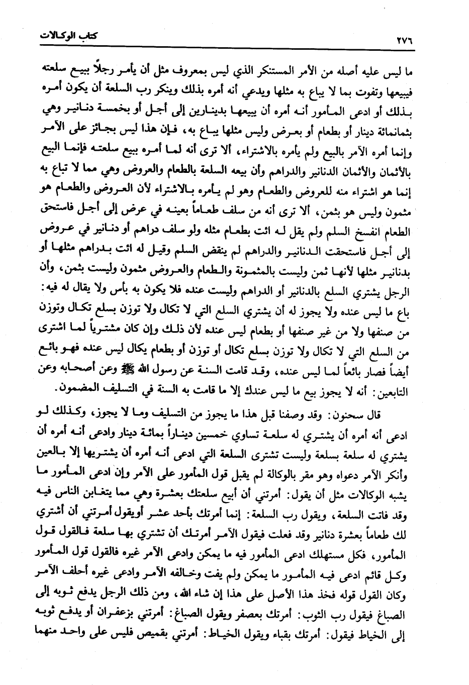 مَا لَيْسَ عَلَيْهِ أَصْلُهُ مِنْ الْأَمْرِ الْمُسْتَنْكَرِ الَّذِي لَيْسَ بِمَعْرُوفٍ مِثْلُ أَنْ يَأْمُرَ رَجُلًا بِبَيْعِ سِلْعَتِهِ فَيَبِيعَهَا وَتَفُوتُ بِمَا لَا يُبَاعُ بِهِ مِثْلُهَا وَيَدَّعِي أَنَّهُ أَمَرَهُ بِذَلِكَ وَيُنْكِرُ رَبُّ السِّلْعَةِ أَنْ يَكُونَ أَمَرَهُ بِذَلِكَ أَوْ ادَّعَى الْمَأْمُورُ أَنَّهُ أَمَرَهُ أَنْ يَبِيعَهَا بِدِينَارَيْنِ إلَى أَجَلٍ أَوْ بِخَمْسَةِ دَنَانِيرَ وَهِيَ بِثَمَانِمِائَةِ دِينَارٍ أَوْ بِطَعَامٍ أَوْ بِعَرَضٍ وَلَيْسَ مِثْلُهَا يُبَاعُ بِهِ، فَإِنَّ هَذَا لَيْسَ بِجَائِزٍ عَلَى الْآمِرِ وَإِنَّمَا أَمَرَهُ الْآمِرُ بِالْبَيْعِ وَلَمْ يَأْمُرْهُ بِالِاشْتِرَاءِ، أَلَا تَرَى أَنَّهُ لَمَّا أَمَرَهُ بِبَيْعِ سِلْعَتِهِ فَإِنَّمَا الْبَيْعُ بِالْأَثْمَانِ وَالْأَثْمَانُ الدَّنَانِيرُ وَالدَّرَاهِمُ وَأَنَّ بَيْعَهُ السِّلْعَةَ بِالطَّعَامِ وَالْعُرُوضِ وَهِيَ مِمَّا لَا تُبَاعُ بِهِ إنَّمَا هُوَ اشْتِرَاءٌ مِنْهُ لِلْعُرُوضِ وَالطَّعَامِ وَهُوَ لَمْ يَأْمُرْهُ بِالِاشْتِرَاءِ لِأَنَّ الْعُرُوضَ وَالطَّعَامَ هُوَ مَثْمُونٌ وَلَيْسَ هُوَ بِثَمَنٍ، أَلَا تَرَى أَنَّهُ مَنْ سَلَّفَ طَعَامًا بِعَيْنِهِ فِي عَرَضٍ إلَى أَجَلٍ فَاسْتَحَقَّ الطَّعَامَ انْفَسَخَ السَّلَمُ وَلَمْ يَقُلْ لَهُ ائْتِ بِطَعَامٍ مِثْلِهِ.