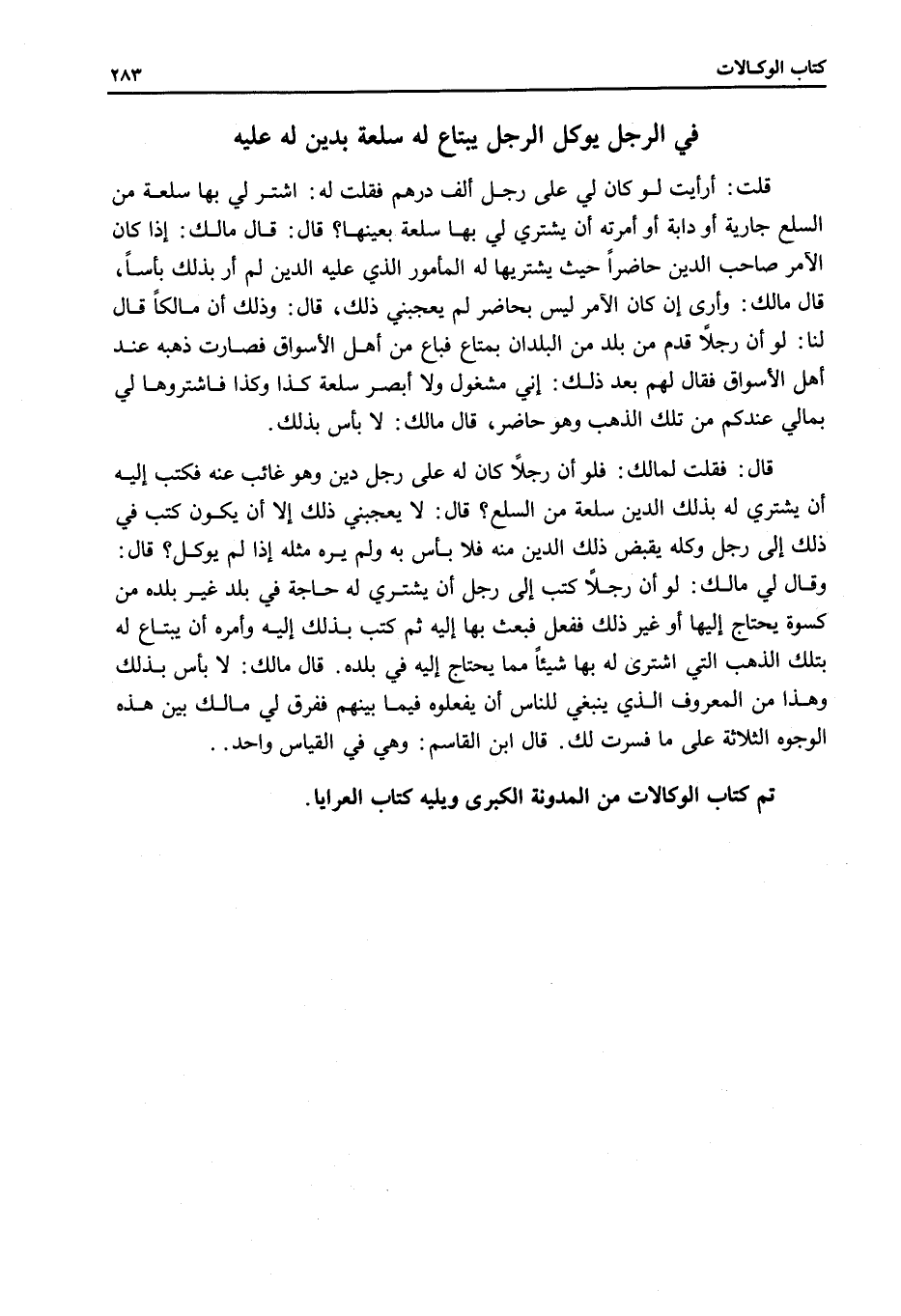 فِي الرَّجُلِ يُوَكِّلُ الرَّجُلَ يَبْتَاعُ لَهُ سِلْعَةً بِدَيْنٍ لَهُ عَلَيْهِ قُلْت: أَرَأَيْتَ لَوْ كَانَ لِي عَلَى رَجُلٍ أَلْفُ دِرْهَمٍ فَقُلْتُ لَهُ: اشْتَرِ لِي بِهَا سِلْعَةً مَنْ السِّلَعِ جَارِيَةً أَوْ دَابَّةً أَوْ أَمَرْتُهُ أَنْ يَشْتَرِيَ لِي بِهَا سِلْعَةً بِعَيْنِهَا؟ قَالَ: قَالَ مَالِكٌ: إذَا كَانَ الْآمِرُ صَاحِبَ الدَّيْنِ حَاضِرًا حَيْثُ يَشْتَرِيَهَا لَهُ الْمَأْمُورُ الَّذِي عَلَيْهِ الدَّيْنُ لَمْ أَرَ بِذَلِكَ بَأْسًا، قَالَ مَالِكٌ: وَأَرَى إنْ كَانَ الْآمِرُ لَيْسَ بِحَاضِرٍ لَمْ يُعْجِبْنِي ذَلِكَ، قَالَ: وَذَلِكَ أَنَّ مَالِكًا قَالَ لَنَا: لَوْ أَنَّ رَجُلًا قَدِمَ مِنْ بَلَدٍ مِنْ الْبُلْدَانِ بِمَتَاعٍ فَبَاعَ مِنْ أَهْلِ الْأَسْوَاقِ فَصَارَتْ ذَهَبُهُ عِنْدَ أَهْلِ الْأَسْوَاقِ فَقَالَ لَهُمْ بَعْدَ ذَلِكَ: إنِّي مَشْغُولٌ وَلَا أُبْصِرُ سِلْعَةَ كَذَا وَكَذَا فَاشْتَرُوهَا لِي بِمَالِي عِنْدَكُمْ مِنْ تِلْكَ الذَّهَبِ وَهُوَ حَاضِرٌ، قَالَ مَالِكٌ: لَا بَأْسَ بِذَلِكَ. قَالَ: فَقُلْتُ لِمَالِكٍ فَلَوْ أَنَّ رَجُلًا كَانَ لَهُ عَلَى رَجُلٍ دَيْنٌ وَهُوَ غَائِبٌ عَنْهُ فَكَتَبَ إلَيْهِ أَنْ يَشْتَرِيَ لَهُ بِذَلِكَ الدَّيْنِ سِلْعَةً مِنْ السِّلَعِ؟ قَالَ: لَا يُعْجِبُنِي ذَلِكَ إلَّا أَنْ يَكُونَ كَتَبَ فِي ذَلِكَ إلَى رَجُلٍ وَكَّلَهُ بِقَبْضِ ذَلِكَ الدَّيْنِ مِنْهُ فَلَا بَأْسَ بِهِ وَلَمْ يَرَهُ مِثْلَهُ إذَا لَمْ يُوَكِّلْ؟