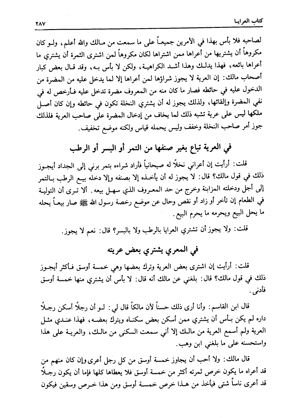 فِي الْعَرِيَّةِ تُبَاعُ بِغَيْرِ صِنْفِهَا مِنْ التَّمْرِ أَوْ الْبُسْرِ أَوْ الرُّطَبِ قُلْتُ: أَرَأَيْتَ إنْ أَعْرَانِي نَخْلًا لَهُ صَيْحَانِيًّا فَأَرَادَ شِرَاءَهُ بِتَمْرٍ بَرْنِيِّ إلَى الْجَدَادِ أَيَجُوزُ ذَلِكَ فِي قَوْلِ مَالِكٍ؟ قَالَ: لَا يَجُوزُ لَهُ أَنْ يَأْخُذَهُ إلَّا بِصِنْفِهِ وَإِلَّا دَخَلَهُ بَيْعُ الرُّطَبِ بِالتَّمْرِ إلَى أَجَلٍ وَدَخَلَتْهُ الْمُزَابَنَةُ وَخَرَجَ مِنْ حَدِّ الْمَعْرُوفِ الَّذِي سَهُلَ بَيْعُهُ. أَلَا تَرَى أَنَّ التَّوْلِيَةَ فِي الطَّعَامِ إنْ تَأَخَّرَ أَوْ زَادَ أَوْ نَقَصَ وَحَالَ عَنْ مَوْضِعِ رُخْصَةِ رَسُولِ اللَّهِ - صَلَّى اللَّهُ عَلَيْهِ وَسَلَّمَ - صَارَ بَيْعًا يَحِلُّهُ مَا يَحِلُّ الْبَيْعَ وَيُحَرِّمُهُ مَا يُحَرِّمُ الْبَيْعَ.