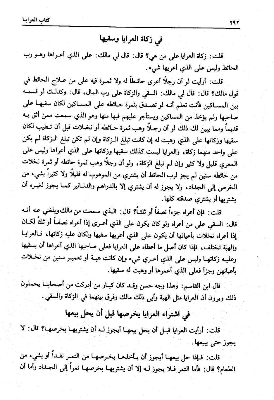 فِي زَكَاةِ الْعَرَايَا وَسَقْيِهَا قُلْتُ: زَكَاةُ الْعَرَايَا عَلَى مَنْ هِيَ؟ قَالَ: قَالَ لِي مَالِكٌ: عَلَى الَّذِي أَعْرَاهَا وَهُوَ رَبُّ الْحَائِطِ وَلَيْسَ عَلَى الَّذِي أُعْرِيَهَا شَيْءٌ.