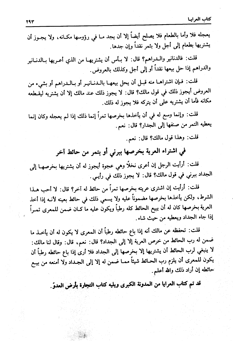 فِي اشْتِرَاءِ الْعَرِيَّةِ بِخَرْصِهَا بِبَرْنِيِّ أَوْ بِتَمْرٍ مِنْ حَائِطٍ آخَرَ قُلْتُ: أَرَأَيْتَ الرَّجُلَ إنْ أَعْرَى نَخْلًا وَهِيَ عَجْوَةٌ أَيَجُوزُ لَهُ أَنْ يَشْتَرِيَهَا بِخَرْصِهَا إلَى الْجَدَادِ بِبِرْنِيٍّ فِي قَوْلِ مَالِكٍ؟ .