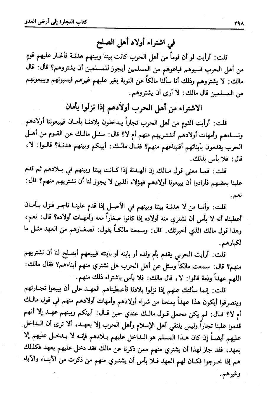 قُلْتُ: أَرَأَيْتَ الْقَوْمَ مِنْ أَهْلِ الْحَرْبِ تُجَّارًا يَدْخُلُونَ بِلَادَنَا بِأَمَانٍ فَيَبِيعُونَنَا أَوْلَادَهُمْ وَنِسَاءَهُمْ وَأُمَّهَاتِ أَوْلَادِهِمْ أَنَشْتَرِيهِمْ مِنْهُمْ أَمْ لَا؟ قَالَ: سُئِلَ مَالِكٌ عَنْ الْقَوْمِ مِنْ أَهْلِ الْحَرْبِ يَقْدَمُونَ بِأَبْنَائِهِمْ أَفَنَبْتَاعُهُمْ مِنْهُمْ؟ فَقَالَ مَالِكٌ: أَبَيْنَكُمْ وَبَيْنَهُمْ هُدْنَةٌ قَالُوا: لَا، قَالَ: فَلَا بَأْسَ بِذَلِكَ.