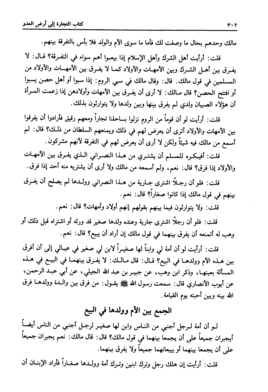 قُلْتُ: أَرَأَيْتَ لَوْ أَنَّ قَوْمًا مِنْ الرُّومِ نَزَلُوا بِسَاحِلِنَا تُجَّارًا وَمَعَهُمْ رَقِيقٌ فَأَرَادُوا أَنْ يُفَرِّقُوا بَيْنَ الْأُمَّهَاتِ وَالْأَوْلَادِ أَتَرَى أَنْ يَعْرِضَ لَهُمْ فِي ذَلِكَ وَيَمْنَعَهُمْ السُّلْطَانُ مِنْ ذَلِكَ؟ قَالَ لَمْ أَسْمَعْ مِنْ مَالِكٍ فِيهِ شَيْئًا وَلَكِنْ لَا أَرَى أَنْ يَعْرِضَ لَهُمْ فِي التَّفْرِقَةِ؛ لِأَنَّهُمْ مُشْرِكُونَ.