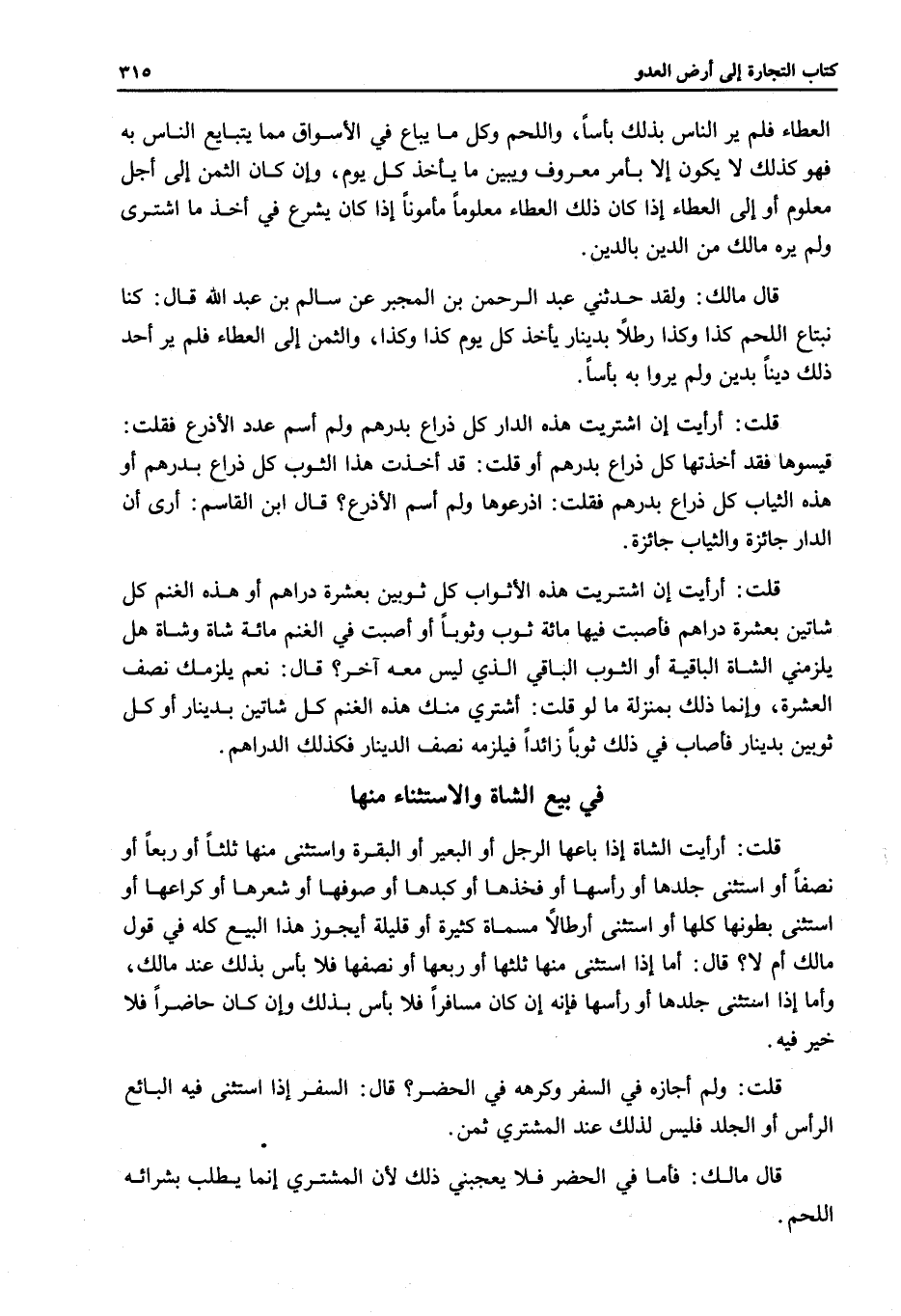 فِي بَيْعِ الشَّاةِ وَالِاسْتِثْنَاءِ مِنْهَا قُلْتُ: أَرَأَيْتَ الشَّاةَ إذَا بَاعَهَا الرَّجُلُ أَوْ الْبَعِيرَ أَوْ الْبَقَرَةَ وَاسْتَثْنَى مِنْهَا ثُلُثًا أَوْ رُبْعًا أَوْ نِصْفًا أَوْ اسْتَثْنَى جِلْدَهَا أَوْ رَأْسَهَا أَوْ فَخِذَهَا أَوْ كَبِدَهَا أَوْ صُوفَهَا أَوْ شَعْرَهَا أَوْ كُرَاعَهَا أَوْ اسْتَثْنَى بُطُونَهَا كُلَّهَا أَوْ اسْتَثْنَى أَرْطَالًا مُسَمَّاةً، كَثِيرَةً أَوْ قَلِيلَةً أَيَجُوزُ هَذَا الْبَيْعُ كُلُّهُ فِي قَوْلِ مَالِكٍ أَمْ لَا؟