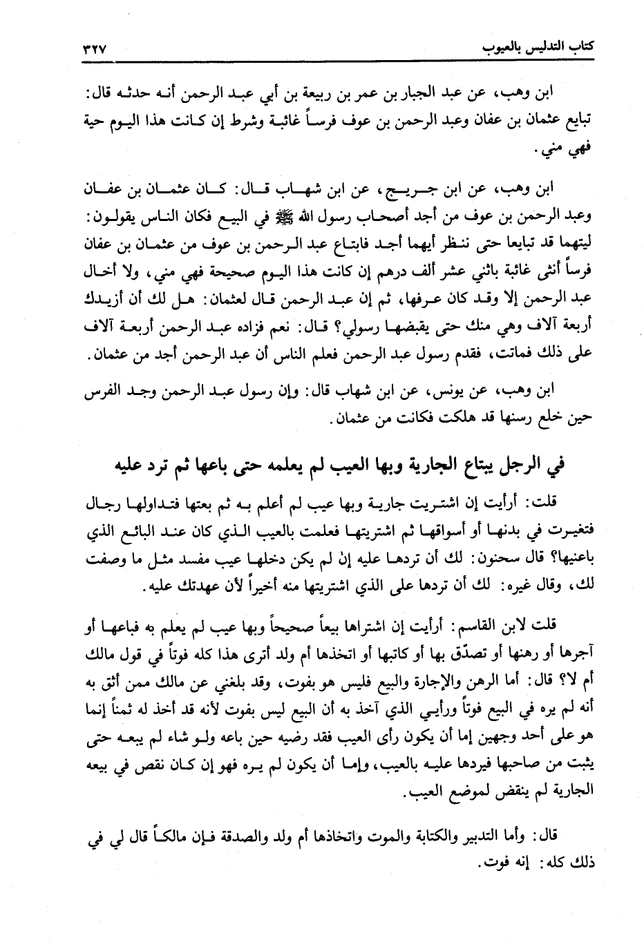 ابْنُ وَهْبٍ، عَنْ عَبْدِ الْجَبَّارِ بْنِ عُمَرَ بْنِ رَبِيعَةَ بْنِ أَبِي عَبْدِ الرَّحْمَنِ أَنَّهُ حَدَّثَهُ قَالَ: تَبَايَعَ عُثْمَانُ بْنُ عَفَّانَ وَعَبْدُ الرَّحْمَنِ بْنُ عَوْفٍ فَرَسًا غَائِبَةً وَشَرَطَ إنْ كَانَتْ هَذَا الْيَوْمَ حَيَّةً فَهِيَ مِنِّي. ابْنُ وَهْبٍ، عَنْ ابْنِ جُرَيْجٍ، عَنْ ابْنِ شِهَابٍ قَالَ: كَانَ عُثْمَانُ بْنُ عَفَّانَ وَعَبْدُ الرَّحْمَنِ بْنُ عَوْفٍ مِنْ أَجَدِّ أَصْحَابِ رَسُولِ اللَّهِ - صَلَّى اللَّهُ عَلَيْهِ وَسَلَّمَ - فِي الْبَيْعِ فَكَانَ النَّاسُ يَقُولُونَ: لَيْتَهُمَا قَدْ تَبَايَعَا حَتَّى نَنْظُرَ أَيُّهُمَا أَجَدُّ فَابْتَاعَ عَبْدُ الرَّحْمَنِ بْنُ عَوْفٍ مِنْ عُثْمَانَ بْنِ عَفَّانَ فَرَسًا أُنْثَى غَائِبَةً بِاثْنَيْ عَشَرَ أَلْفَ دِرْهَمٍ إنْ كَانَتْ هَذَا الْيَوْمَ صَحِيحَةً فَهِيَ مِنِّي، وَلَا أَخَالُ عَبْدَ الرَّحْمَنِ إلَّا وَقَدْ كَانَ عَرَفَهَا، ثُمَّ إنَّ عَبْدَ الرَّحْمَنِ قَالَ لِعُثْمَانَ: هَلْ لَكَ أَنْ أَزِيدَكَ أَرْبَعَةَ آلَافٍ وَهِيَ مِنْكَ حَتَّى يَقْبِضَهَا رَسُولِي؟ قَالَ: نَعَمْ فَزَادَهُ عَبْدُ الرَّحْمَنِ أَرْبَعَةَ آلَافٍ عَلَى ذَلِكَ فَمَاتَتْ، فَقَدِمَ رَسُولُ عَبْدِ الرَّحْمَنِ فَعَلِمَ النَّاسُ أَنَّ عَبْدَ الرَّحْمَنِ أَجَدُّ مِنْ عُثْمَانَ. ابْنُ وَهْبٍ، عَنْ يُونُسَ، عَنْ ابْنِ شِهَابٍ قَالَ: وَإِنَّ رَسُولَ عَبْدِ الرَّحْمَنِ وَجَدَ الْفَرَسَ حِينَ خَلَعَ رَسَنَهَا قَدْ هَلَكَتْ فَكَانَتْ مِنْ عُثْمَانَ