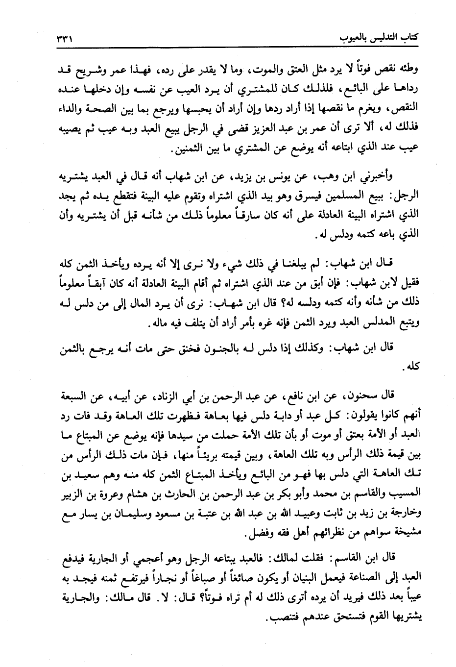 قَالَ سَحْنُونٌ، عَنْ ابْنِ نَافِعٍ، عَنْ عَبْدِ الرَّحْمَنِ بْنِ أَبِي الزِّنَادِ، عَنْ أَبِيهِ، عَنْ السَّبْعَةِ أَنَّهُمْ كَانُوا يَقُولُونَ: كُلُّ عَبْدٍ أَوْ دَابَّةٍ دَلَّسَ فِيهَا بِعَاهَةٍ فَظَهَرَتْ تِلْكَ الْعَاهَةُ وَقَدْ فَاتَ رَدُّ الْعَبْدِ أَوْ الْأَمَةِ بِعِتْقٍ أَوْ مَوْتٍ أَوْ بِأَنَّ تِلْكَ الْأَمَةَ حَمَلَتْ مِنْ سَيِّدِهَا فَإِنَّهُ يُوضَعُ عَنْ الْمُبْتَاعِ مَا بَيْنَ قِيمَةِ ذَلِكَ الرَّأْسِ وَبِهِ تِلْكَ الْعَاهَةِ، وَبَيْنَ قِيمَتِهِ بَرِيئًا مِنْهَا، فَإِنْ مَاتَ ذَلِكَ الرَّأْسُ مِنْ تِلْكَ الْعَاهَةِ الَّتِي دَلَّسَ بِهَا فَهُوَ مِنْ الْبَائِعِ وَيَأْخُذُ الْمُبْتَاعُ الثَّمَنَ كُلَّهُ مِنْهُ وَهُمْ سَعِيدُ بْنُ الْمُسَيِّبِ وَالْقَاسِمُ بْنُ مُحَمَّدٍ وَأَبُو بَكْرِ بْنُ عَبْدِ الرَّحْمَنِ بْنِ الْحَارِثِ بْنِ هِشَامٍ وَعُرْوَةُ بْنُ الزُّبَيْرِ وَخَارِجَةُ بْنُ زَيْدِ بْنِ ثَابِتٍ وَعُبَيْدُ اللَّهِ بْنُ عَبْدِ اللَّهِ بْنِ عُتْبَةَ بْنِ مَسْعُودٍ وَسُلَيْمَانُ بْنُ يَسَارٍ مَعَ مَشْيَخَةٍ سِوَاهُمْ مِنْ نُظَرَائِهِمْ أَهْلُ فِقْهٍ وَفَضْلٍ