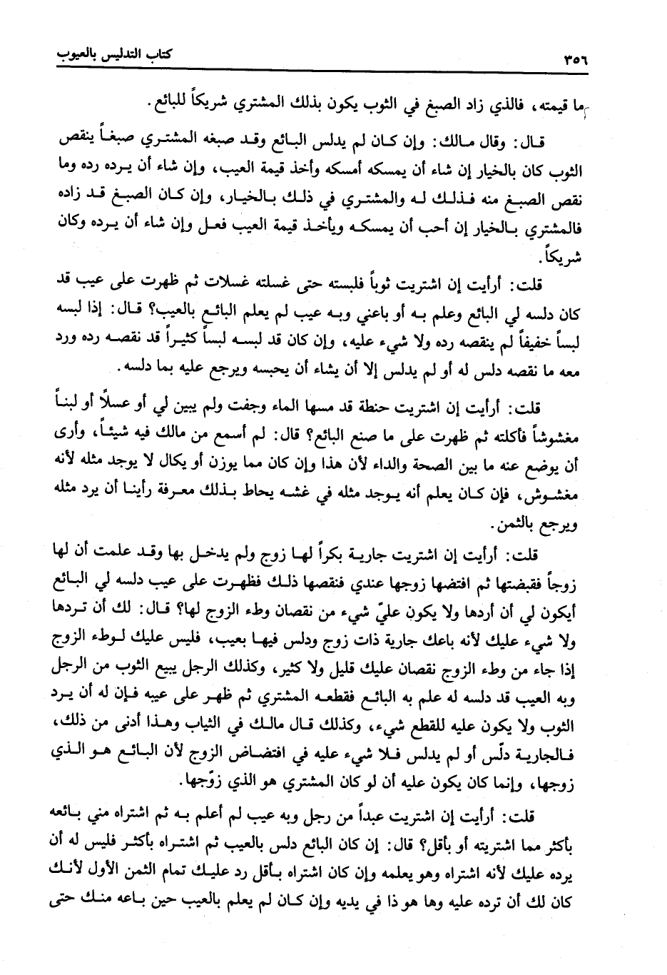 قُلْتُ: أَرَأَيْتَ إنْ اشْتَرَيْت عَبْدًا مَنْ رَجُلٍ وَبِهِ عَيْبٌ لَمْ أَعْلَمْ بِهِ ثُمَّ اشْتَرَاهُ مِنِّي بَائِعُهُ بِأَكْثَرَ مِمَّا اشْتَرَيْته أَوْ بِأَقَلَّ؟ قَالَ: إنْ كَانَ الْبَائِعُ دَلَّسَ بِالْعَيْبِ ثُمَّ اشْتَرَاهُ بِأَكْثَرَ فَلَيْسَ لَهُ أَنْ يَرُدَّهُ عَلَيْكَ؛ لِأَنَّهُ اشْتَرَاهُ وَهُوَ يَعْلَمُهُ، وَإِنْ كَانَ اشْتَرَاهُ بِأَقَلَّ رَدَّ عَلَيْكَ تَمَامَ الثَّمَنِ الْأَوَّلِ؛ لِأَنَّكَ كَانَ لَكَ أَنْ تَرُدَّهُ عَلَيْهِ وَهَا هُوَ ذَا فِي يَدَيْهِ، وَإِنْ كَانَ لَمْ يَعْلَمْ بِالْعَيْبِ حِينَ بَاعَهُ مِنْكَ حَتَّى اشْتَرَاهُ مِنْكَ بِأَكْثَرَ فَلَهُ أَنْ يَرُدَّهُ عَلَيْكَ وَيَأْخُذُ الثَّمَنَ وَلَكَ أَنْ تَرُدَّهُ عَلَيْهِ، وَإِنْ كَانَ اشْتَرَاهُ بِمِثْلِ الثَّمَنِ الْأَوَّلِ فَكَأَنَّهُ رَدَّ عَلَيْهِ، وَإِنْ كَانَ