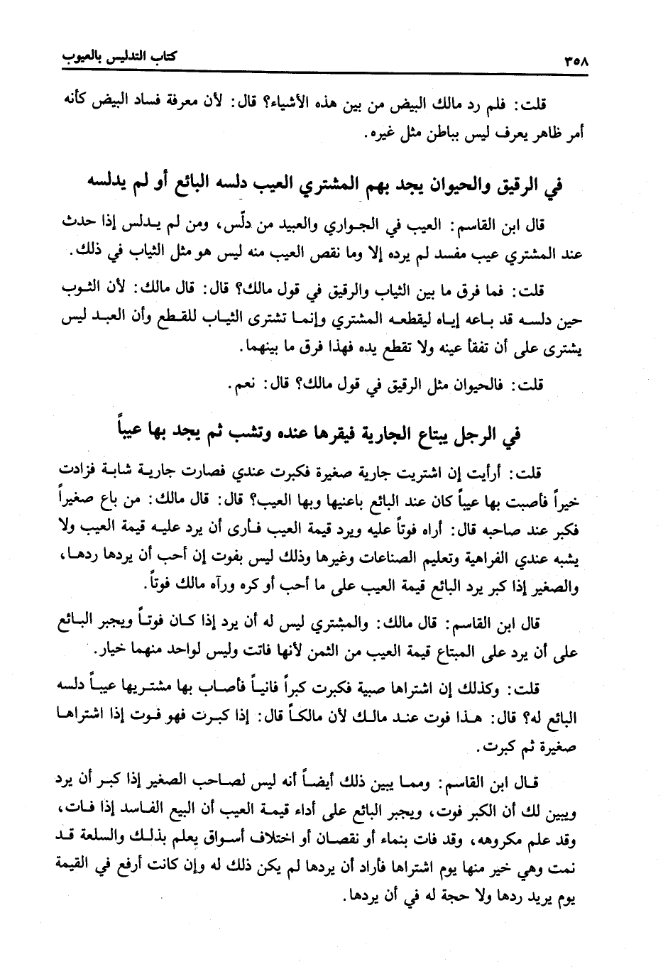فِي الرَّقِيقِ وَالْحَيَوَانِ يَجِدُ بِهِمْ الْمُشْتَرِي الْعَيْبَ دَلَّسَهُ الْبَائِعُ أَوْ لَمْ يُدَلِّسْهُ قَالَ ابْنُ الْقَاسِمِ: الْعَيْبُ فِي الْجَوَارِي وَالْعَبِيدِ مَنْ دَلَّسَ، وَمَنْ لَمْ يُدَلِّسْ إذَا حَدَثَ عِنْدَ الْمُشْتَرِي عَيْبٌ مُفْسِدٌ لَمْ يَرُدَّهُ إلَّا وَمَا نَقَصَ الْعَيْبُ مِنْهُ لَيْسَ هُوَ مِثْلُ الثِّيَابِ فِي ذَلِكَ.