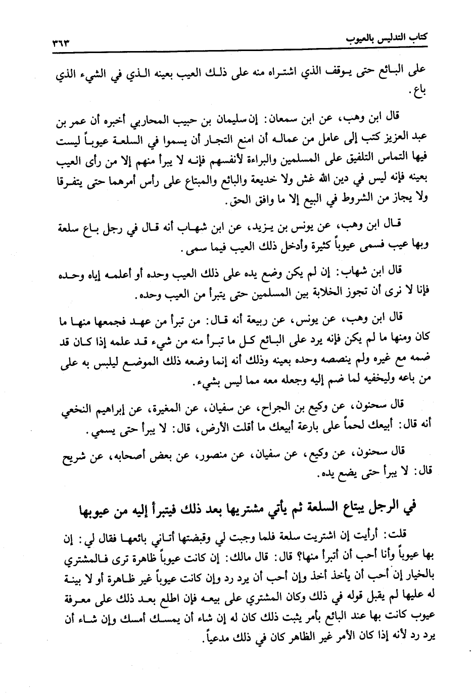 قَالَ ابْنُ وَهْبٍ، عَنْ ابْنِ سَمْعَانَ: إنَّ سُلَيْمَانَ بْنَ حَبِيبٍ الْمُحَارِبِيَّ أَخْبَرَهُ أَنَّ عُمَرَ بْنَ عَبْدِ الْعَزِيزِ كَتَبَ إلَى عَامِلٍ مِنْ عُمَّالِهِ أَنْ امْنَعْ التُّجَّارَ أَنْ يُسَمُّوا فِي السِّلْعَةِ عُيُوبًا لَيْسَتْ فِيهَا الْتِمَاسَ التَّلْفِيقِ عَلَى الْمُسْلِمِينَ وَالْبَرَاءَةِ لِأَنْفُسِهِمْ فَإِنَّهُ لَا يُبَرَّأُ مِنْهُمْ إلَّا مَنْ رَأَى الْعَيْبَ بِعَيْنِهِ فَإِنَّهُ لَيْسَ فِي دِينِ اللَّهِ غِشٌّ وَلَا خَدِيعَةٌ وَالْبَائِعُ وَالْمُبْتَاعُ عَلَى رَأْسِ أَمْرِهِمَا حَتَّى يَتَفَرَّقَا وَلَا يُجَازَ مِنْ الشُّرُوطِ فِي الْبَيْعِ إلَّا مَا وَافَقَ الْحَقَّ.