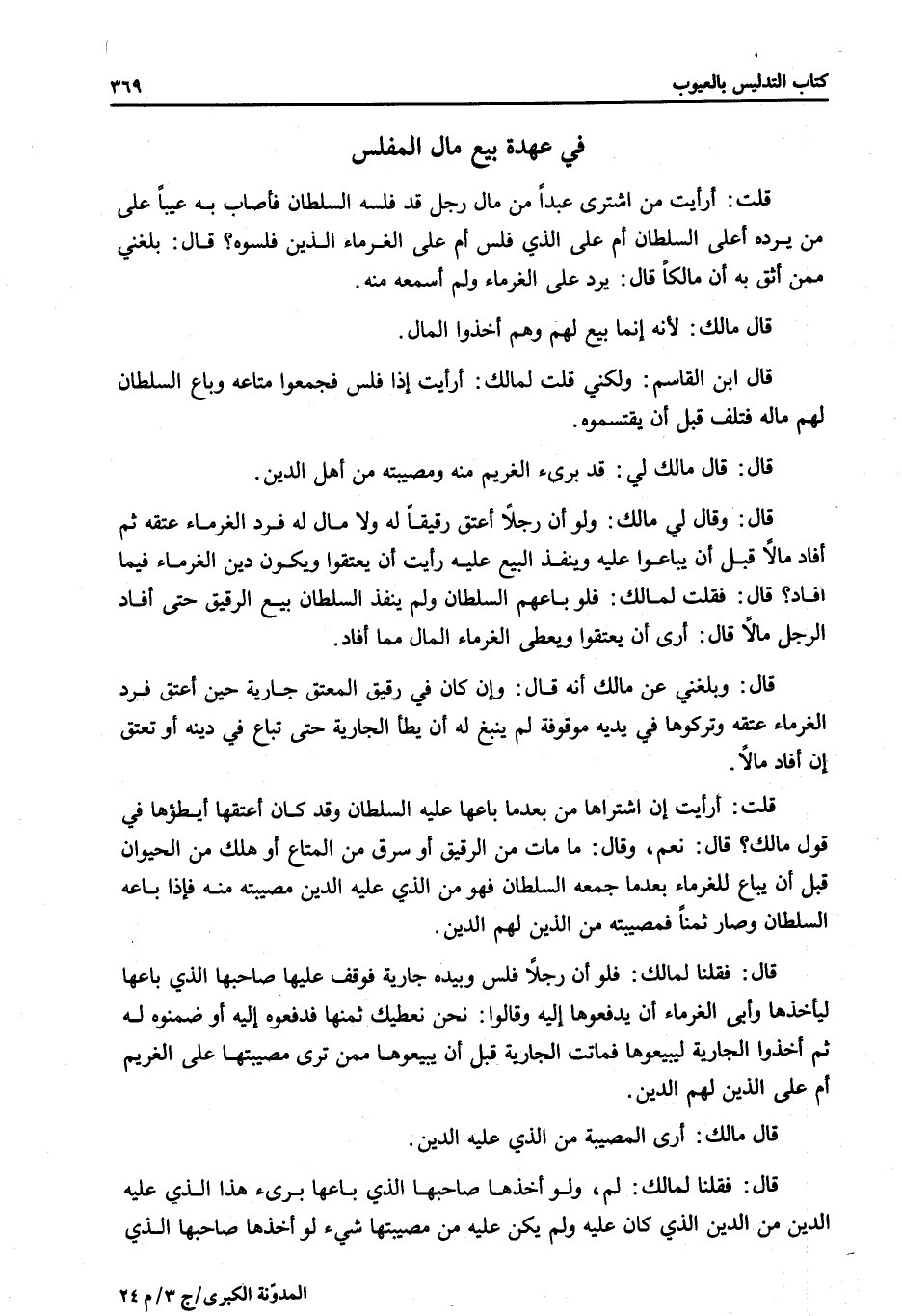 فِي عُهْدَةِ بَيْعِ مَالِ الْمُفْلِسِ قُلْتُ: أَرَأَيْتَ مَنْ اشْتَرَى عَبْدًا مِنْ مَالِ رَجُلٍ قَدْ فَلِسَهُ السُّلْطَانُ فَأَصَابَ بِهِ عَيْبًا عَلَى مَنْ يَرُدُّهُ أَعَلَى السُّلْطَانِ أَمْ عَلَى الَّذِي فَلِسَ أَمْ عَلَى الْغُرَمَاءِ الَّذِينَ فَلِّسُوهُ؟ قَالَ: بَلَغَنِي مِمَّنْ أَثِقُ بِهِ أَنَّ مَالِكًا قَالَ: يَرُدُّ عَلَى الْغُرَمَاءِ وَلَمْ أَسْمَعْهُ مِنْهُ.