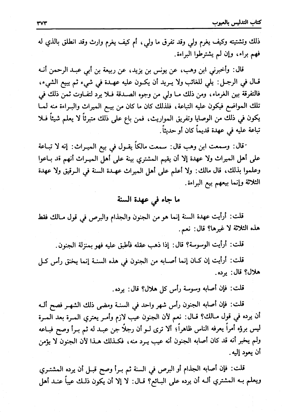 قَالَ: وَسَمِعْتُ ابْنَ وَهْبٍ قَالَ: سَمِعْتُ مَالِكًا يَقُولُ فِي بَيْعِ الْمِيرَاثِ: إنَّهُ لَا تِبَاعَةَ عَلَى أَهْلِ الْمِيرَاثِ وَلَا عُهْدَةَ إلَّا أَنْ يُقِيمَ الْمُشْتَرِي بَيِّنَةً عَلَى أَهْلِ الْمِيرَاثِ أَنَّهُمْ قَدْ بَاعُوا وَعَلِمُوا بِذَلِكَ، قَالَ مَالِكٌ: وَلَا أَعْلَمُ عَلَى أَهْلِ الْمِيرَاثِ عُهْدَةَ السَّنَةِ فِي الرَّقِيقِ وَلَا عُهْدَةَ الثَّلَاثَةِ وَإِنَّمَا بَيْعُهُمْ بَيْعُ الْبَرَاءَةِ.