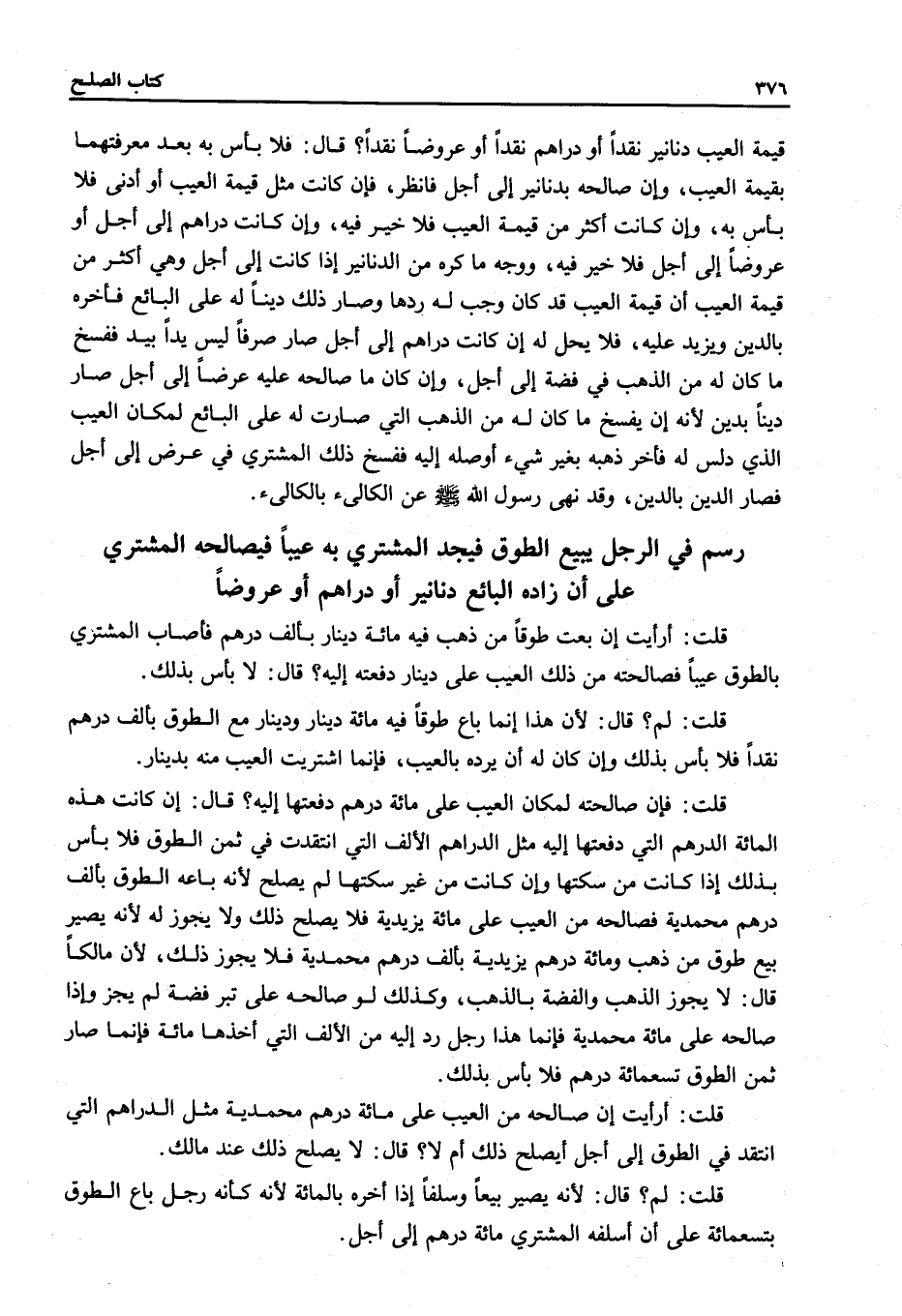 قُلْتُ: أَرَأَيْتَ إنْ صَالَحَهُ مَنْ الْعَيْبِ عَلَى مِائَةِ دِرْهَمٍ مُحَمَّدِيَّةٍ مِثْلِ الدَّرَاهِمِ الَّتِي اُنْتُقِدَ فِي الطَّوْقِ إلَى أَجَلٍ أَيَصْلُحُ ذَلِكَ أَمْ لَا؟ .