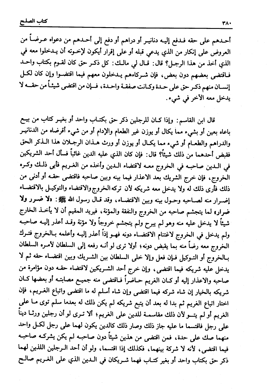 قَالَ: قَالَ لِي مَالِكٌ: كُلُّ ذِكْرِ حَقٍّ كَانَ لِقَوْمٍ بِكِتَابٍ وَاحِدٍ فَاقْتَضَى بَعْضُهُمْ دُونَ بَعْضٍ، فَإِنَّ شُرَكَاءَهُمْ يَدْخُلُونَ مَعَهُمْ فِيمَا اقْتَضَوْا وَإِنْ كَانَ لِكُلِّ إنْسَانٍ مِنْهُمْ ذِكْرُ حَقٍّ عَلَى حِدَةٍ وَكَانَتْ صَفْقَةٌ وَاحِدَةٌ، فَإِنَّ مَنْ اقْتَضَى شَيْئًا مِنْ حَقِّهِ لَا يَدْخُلُ مَعَهُ الْآخَرُ فِي شَيْءٍ.