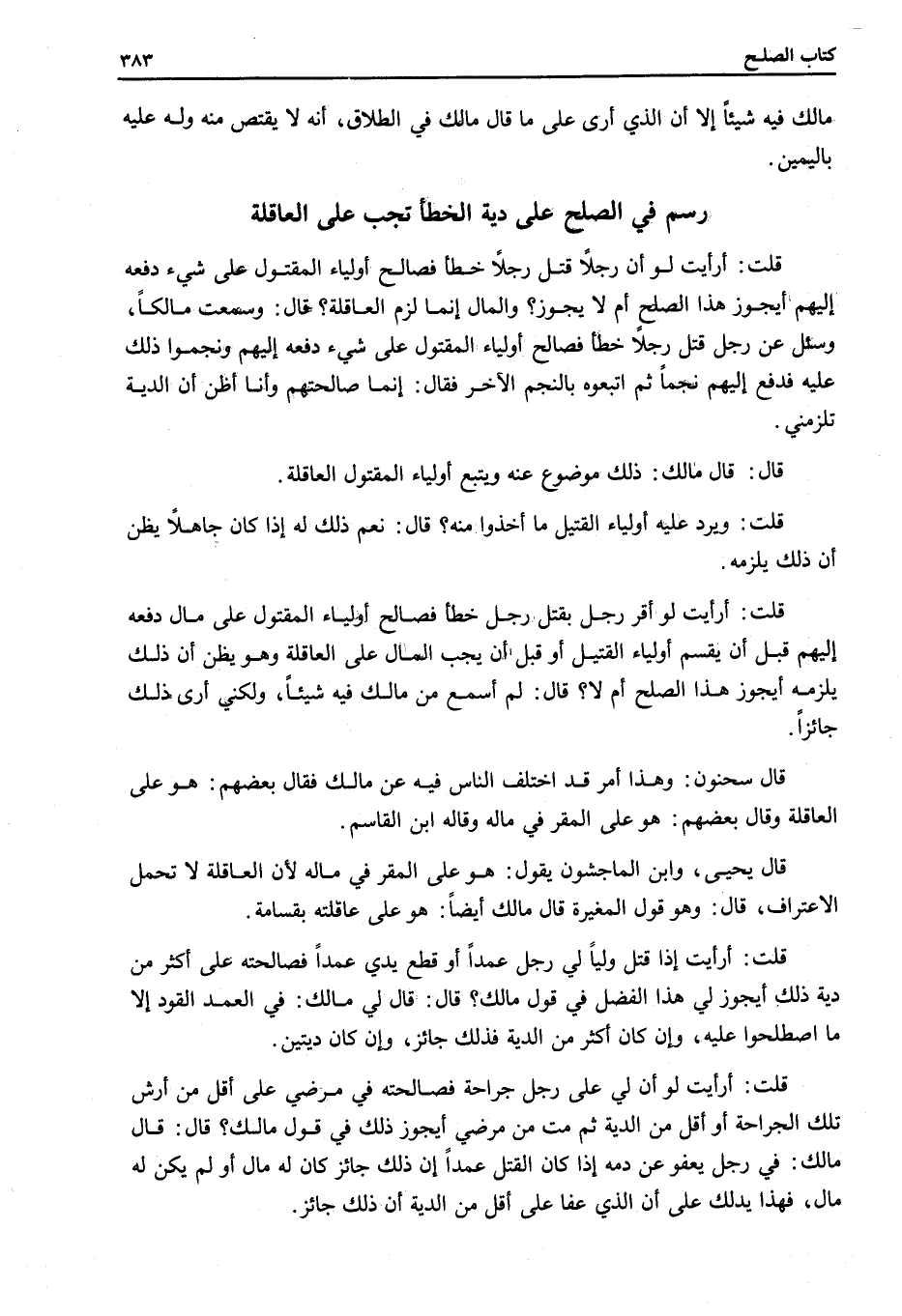 رَسْمٌ فِي الصُّلْحِ عَلَى دِيَةِ الْخَطَإِ تَجِبُ عَلَى الْعَاقِلَةِ. قُلْتُ: أَرَأَيْتَ لَوْ أَنَّ رَجُلًا قَتَلَ رَجُلًا خَطَأً فَصَالَحَ أَوْلِيَاءَ الْمَقْتُولِ عَلَى شَيْءٍ دَفَعَهُ إلَيْهِمْ أَيَجُوزُ هَذَا الصُّلْحُ أَمْ لَا يَجُوزُ؟ وَالْمَالُ إنَّمَا لَزِمَ الْعَاقِلَةَ؟
