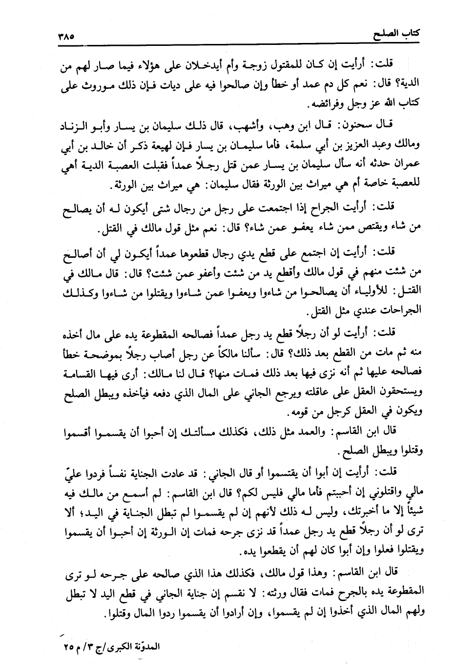 قَالَ سَحْنُونٌ: قَالَ ابْنُ وَهْبٍ، وَأَشْهَبُ، قَالَ ذَلِكَ سُلَيْمَانُ بْنُ يَسَارٍ وَأَبُو الزِّنَادِ وَمَالِكٌ وَعَبْدُ الْعَزِيزِ بْن أَبِي سَلَمَةَ، فَأَمَّا سُلَيْمَانُ بْنُ يَسَارٍ فَإِنَّ لَهِيعَةَ ذَكَرَ أَنَّ خَالِدَ بْنَ أَبِي عِمْرَانَ حَدَّثَهُ أَنَّهُ سَأَلَ سُلَيْمَانَ بْنَ يَسَارٍ عَمَّنْ قَتَلَ رَجُلًا عَمْدًا فَقَبِلَتْ الْعَصَبَةُ الدِّيَةَ أَهِيَ لِلْعَصَبَةِ خَاصَّةً أَمْ هِيَ مِيرَاثٌ بَيْنَ الْوَرَثَةِ؟ فَقَالَ سُلَيْمَانُ: هِيَ مِيرَاثٌ بَيْنَ الْوَرَثَةِ.