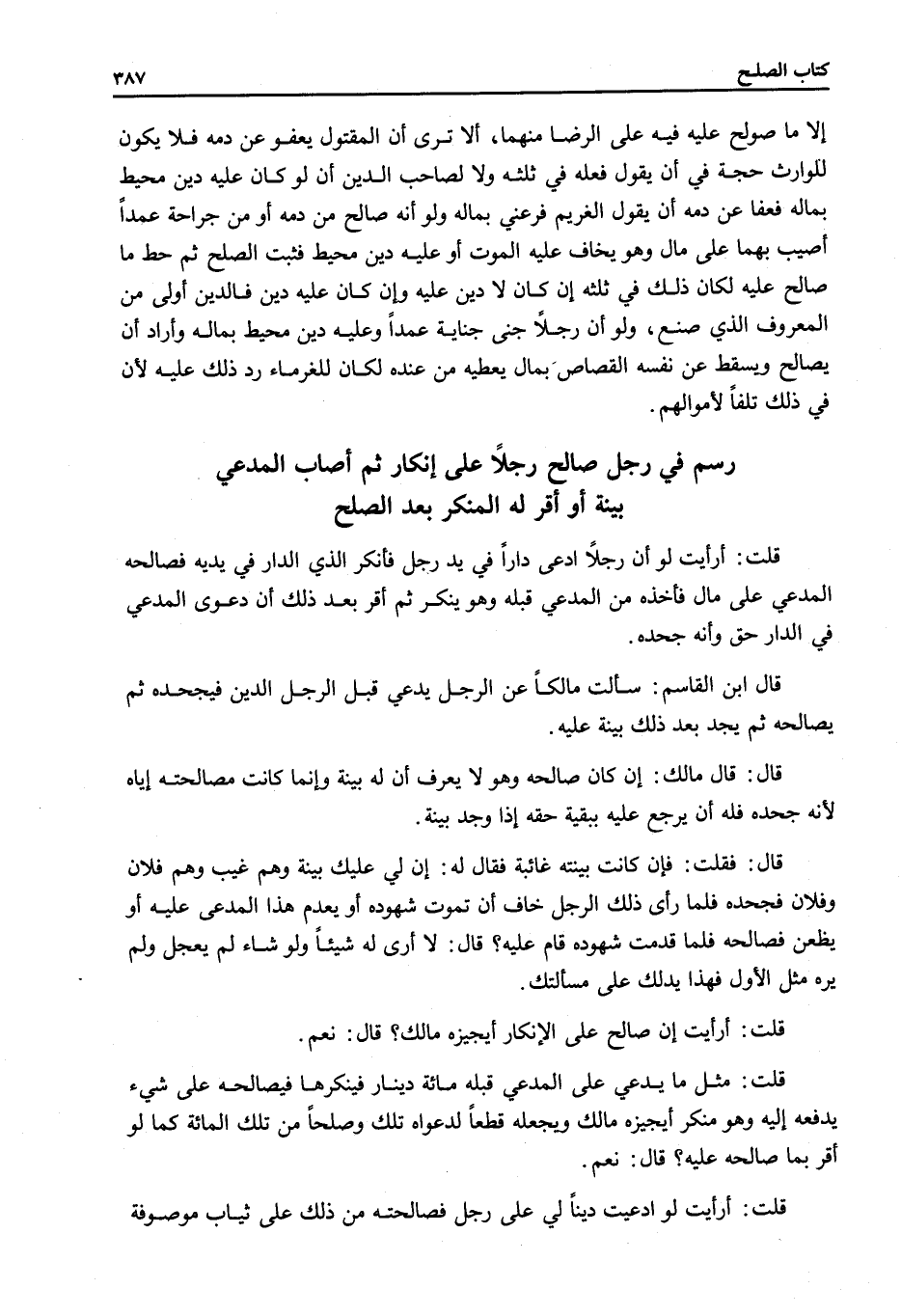 رَسْمٌ فِي رَجُلٍ صَالَحَ رَجُلًا عَلَى إنْكَارٍ ثُمَّ أَصَابَ الْمُدَّعِي بَيِّنَةً أَوْ أَقَرَّ لَهُ الْمُنْكِرُ بَعْدَ الصُّلْحِ قُلْتُ: أَرَأَيْتَ لَوْ أَنَّ رَجُلًا ادَّعَى دَارًا فِي يَدِ رَجُلٍ فَأَنْكَرَ الَّذِي الدَّارُ فِي يَدَيْهِ فَصَالَحَهُ الْمُدَّعِي عَلَى مَالٍ فَأَخَذَهُ مِنْ الْمُدَّعِي قِبَلَهُ وَهُوَ يُنْكِرُ ثُمَّ أَقَرَّ بَعْدَ ذَلِكَ أَنَّ دَعْوَى الْمُدَّعِي فِي الدَّارِ حَقٌّ وَأَنَّهُ جَحَدَهُ.