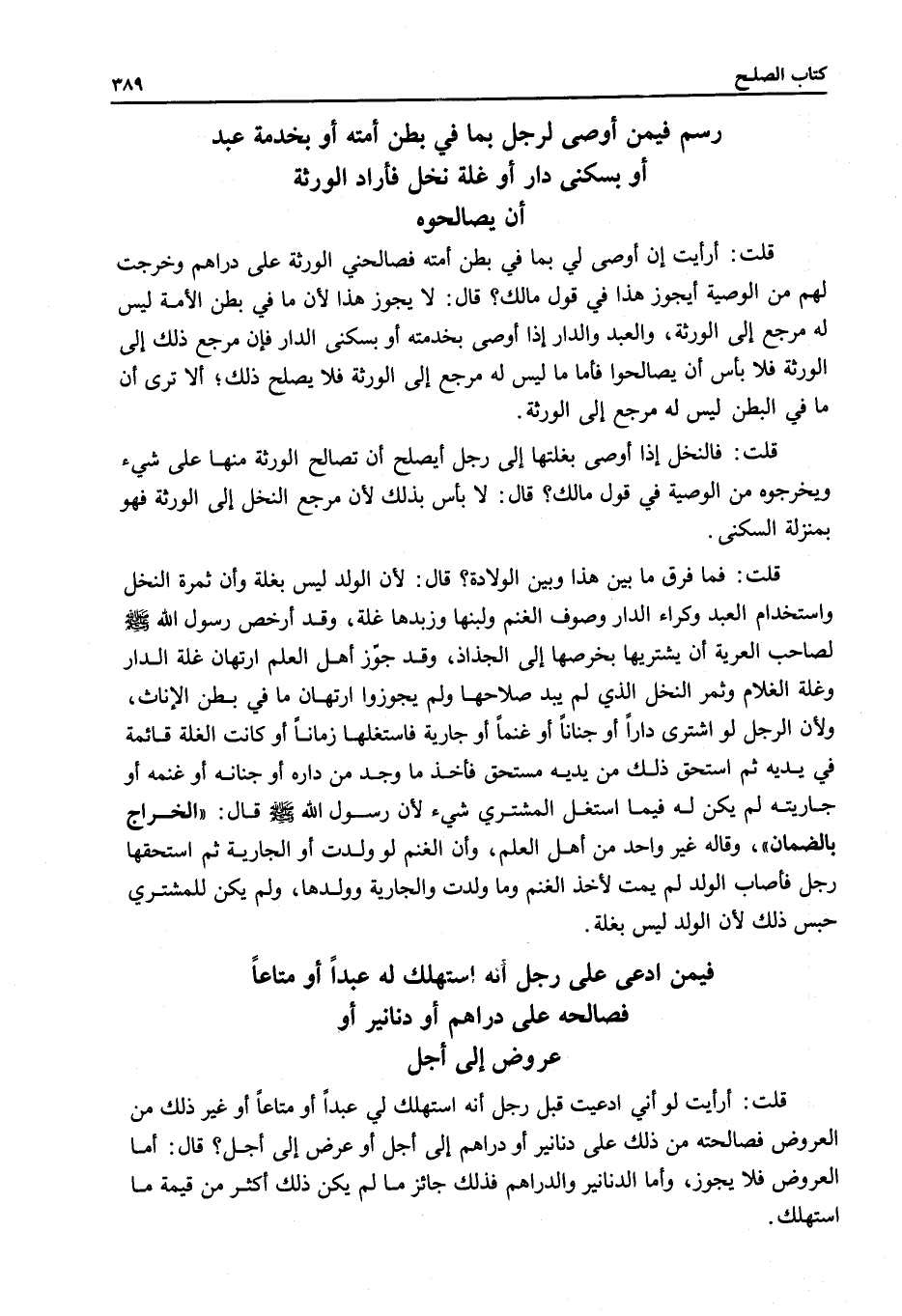 رَسْمٌ فِيمَنْ أَوْصَى لِرَجُلٍ بِمَا فِي بَطْنِ أَمَتِهِ أَوْ بِخِدْمَةِ عَبْدٍ أَوْ بِسُكْنَى دَارٍ أَوْ غَلَّةِ نَخْلٍ فَأَرَادَ الْوَرَثَةُ أَنْ يُصَالِحُوهُ. قُلْتُ: أَرَأَيْتَ إنْ أَوْصَى لِي بِمَا فِي بَطْنِ أَمَتِهِ فَصَالَحَنِي الْوَرَثَةُ عَلَى دَرَاهِمَ وَخَرَجْتُ لَهُمْ مِنْ الْوَصِيَّةِ أَيَجُوزُ هَذَا فِي قَوْلِ مَالِكٍ؟ قَالَ: لَا يَجُوزُ هَذَا؛ لِأَنَّ مَا فِي بَطْنِ الْأَمَةِ لَيْسَ لَهُ مَرْجِعٌ إلَى الْوَرَثَةِ، وَالْعَبْدُ وَالدَّارُ إذَا أَوْصَى بِخِدْمَتِهِ أَوْ بِسُكْنَى الدَّارِ فَإِنَّ مَرْجِعَ ذَلِكَ إلَى الْوَرَثَةِ فَلَا بَأْسَ أَنْ يُصَالِحُوا فَأَمَّا مَا لَيْسَ لَهُ مَرْجِعٌ إلَى الْوَرَثَةِ فَلَا يَصْلُحُ ذَلِكَ؛ أَلَا تَرَى أَنَّ مَا فِي الْبَطْنِ لَيْسَ لَهُ مَرْجِعٌ إلَى الْوَرَثَةِ.