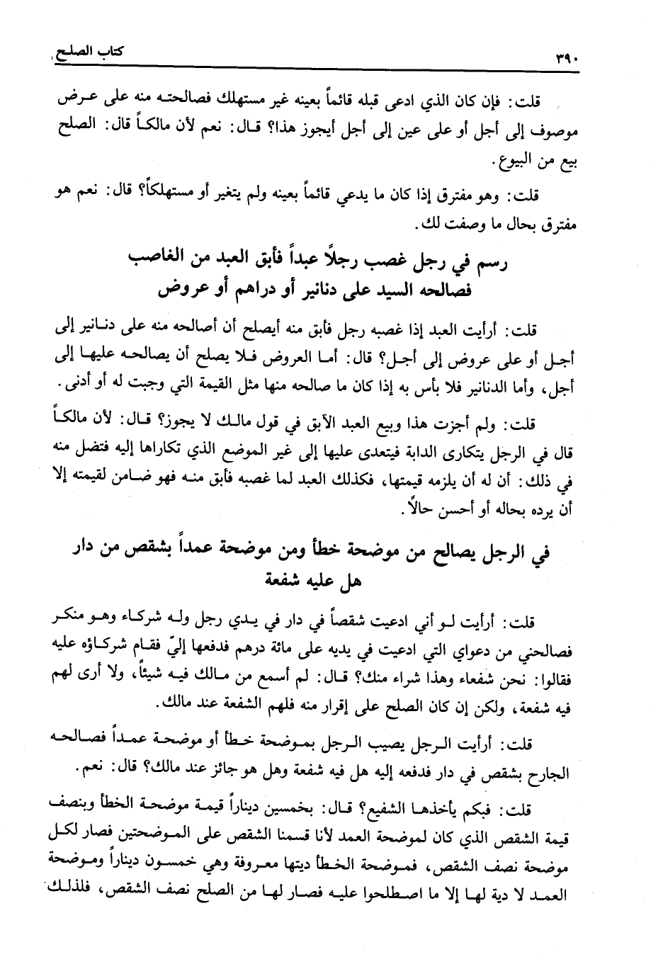 فِي الرَّجُلِ يُصَالَحُ مِنْ مُوضِحَةٍ خَطَأً وَمَنْ مُوضِحَةٍ عَمْدًا بِشِقْصٍ مِنْ دَارٍ هَلْ عَلَيْهِ شُفْعَةٌ. قُلْتُ: أَرَأَيْتَ لَوْ أَنِّي ادَّعَيْتُ شِقْصًا فِي دَارٍ فِي يَدَيْ رَجُلٍ وَلَهُ شُرَكَاءُ وَهُوَ مُنْكِرٌ فَصَالَحَنِي مِنْ دَعْوَايَ الَّتِي ادَّعَيْتُ فِي يَدَيْهِ عَلَى مِائَةِ دِرْهَمٍ فَدَفَعَهَا إلَيَّ فَقَامَ شُرَكَاؤُهُ عَلَيْهِ فَقَالُوا: نَحْنُ شُفَعَاءُ وَهَذَا شِرَاءٌ مِنْكَ؟ قَالَ: لَمْ أَسْمَعْ مِنْ مَالِكٍ فِيهِ شَيْئًا، وَلَا أَرَى لَهُمْ فِيهِ شُفْعَةً، وَلَكِنْ إنْ كَانَ الصُّلْحُ عَلَى إقْرَارٍ مِنْهُ فَلَهُمْ الشُّفْعَةُ عِنْدَ مَالِكٍ.