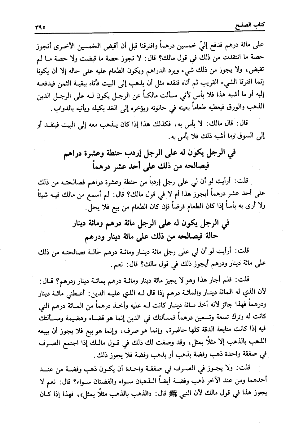 فِي الرَّجُلِ يَكُونُ لَهُ عَلَى الرَّجُلِ مِائَةُ دِرْهَمٍ وَمِائَةُ دِينَارٍ حَالَّةٌ فَيُصَالِحُهُ مِنْ ذَلِكَ عَلَى مِائَةِ دِينَارٍ وَدِرْهَمٍ. قُلْتُ: أَرَأَيْتَ لَوْ أَنَّ لِي عَلَى رَجُلٍ مِائَةَ دِينَارٍ وَمِائَةَ دِرْهَمٍ حَالَّةً فَصَالَحْتُهُ مِنْ ذَلِكَ عَلَى مِائَةِ دِينَارٍ وَدِرْهَمٍ أَيَجُوزُ ذَلِكَ فِي قَوْلِ مَالِكٍ؟
