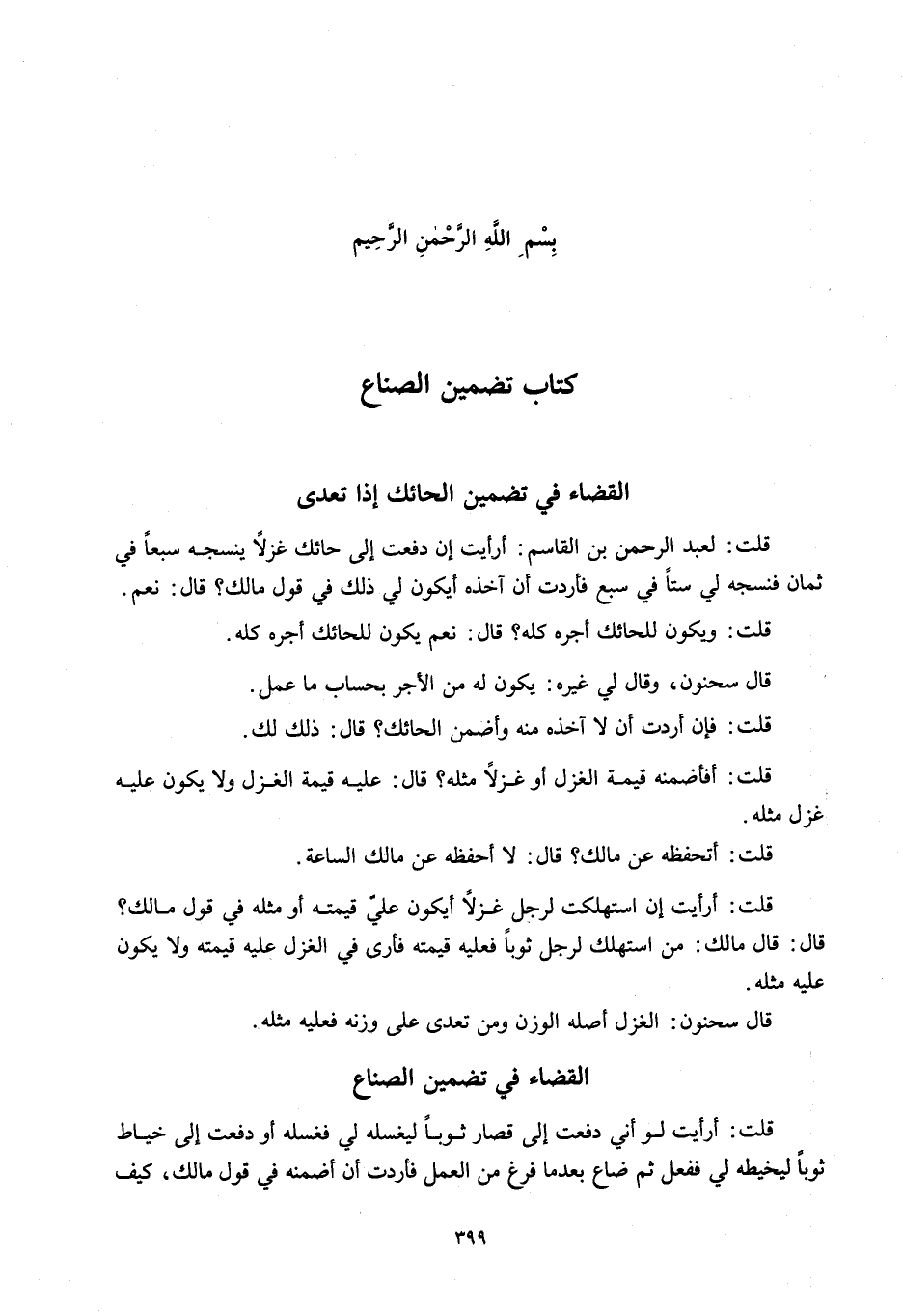 بِسْمِ اللَّهِ الرَّحْمَنِ الرَّحِيمِ كِتَابُ تَضْمِينِ الصُّنَّاعِ الْقَضَاءُ فِي تَضْمِينِ الْحَائِكِ إذَا تَعَدَّى قُلْتُ: لِعَبْدِ الرَّحْمَنِ بْنِ الْقَاسِمِ: أَرَأَيْتَ إنْ دَفَعْت إلَى حَائِكٍ غَزْلًا يَنْسِجُهُ سَبْعًا فِي ثَمَانٍ فَنَسَجَهُ لِي سِتًّا فِي سَبْعٍ فَأَرَدْتُ أَنْ آخُذَهُ أَيَكُونُ لِي ذَلِكَ فِي قَوْلِ مَالِكٍ؟ قَالَ: نَعَمْ.