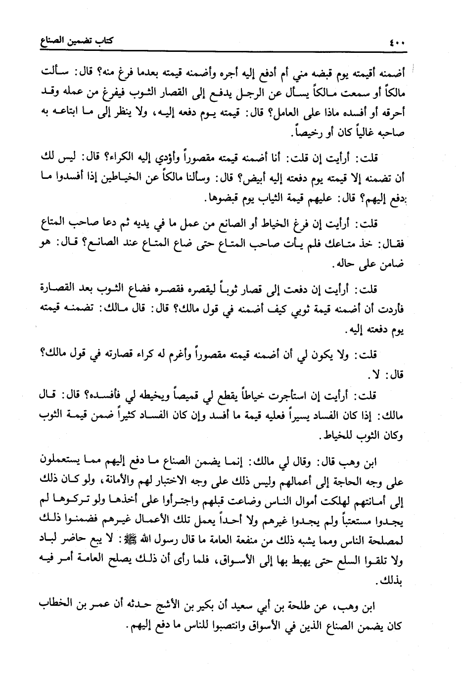 (ابْنُ وَهْبٍ) ، عَنْ طَلْحَةَ بْنِ أَبِي سَعِيدٍ أَنَّ بُكَيْرَ بْنَ الْأَشَجِّ حَدَّثَهُ أَنَّ عُمَرَ بْنَ الْخَطَّابِ كَانَ يُضَمِّنُ الصُّنَّاعَ الَّذِينَ فِي الْأَسْوَاقِ وَانْتَصَبُوا لِلنَّاسِ مَا دُفِعَ إلَيْهِمْ