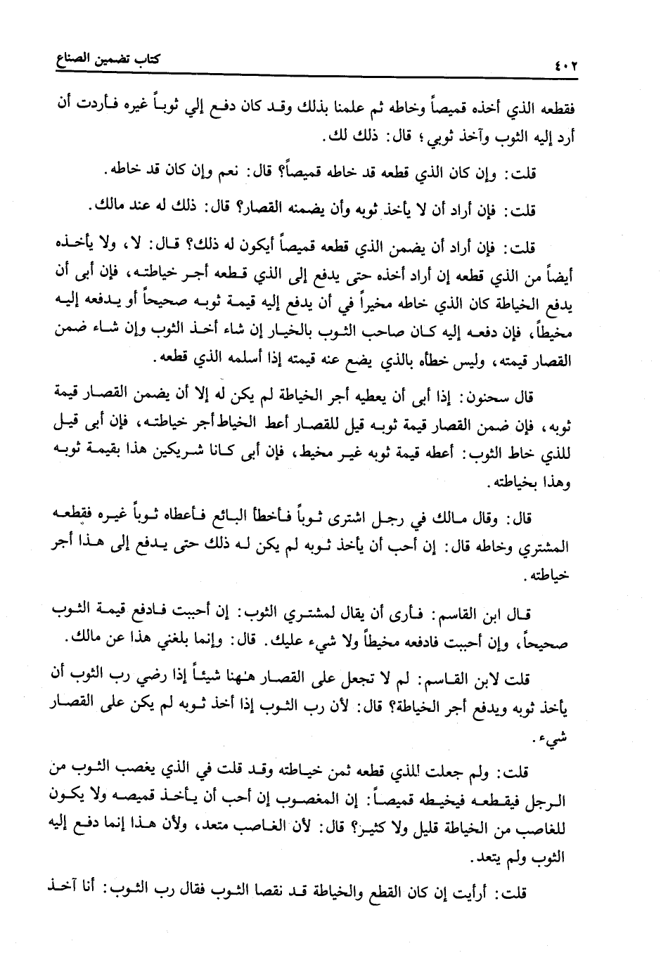 قُلْتُ لِابْنِ الْقَاسِمِ: لِمَ لَا تَجْعَلُ عَلَى الْقَصَّارِ هَاهُنَا شَيْئًا إذَا رَضِيَ رَبُّ الثَّوْبِ أَنْ يَأْخُذَ ثَوْبَهُ وَيَدْفَعَ أَجْرَ الْخِيَاطَةِ؟