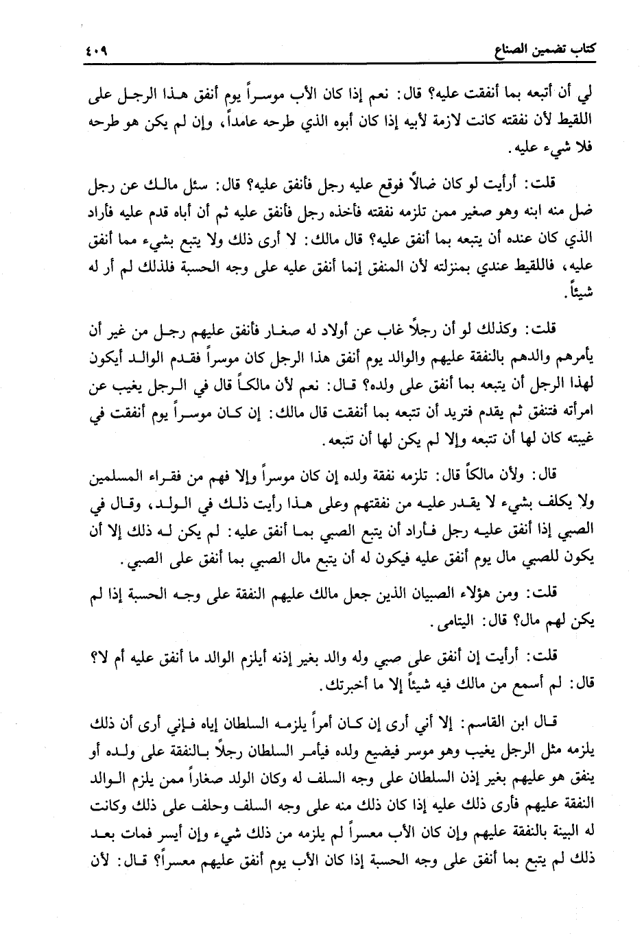 قُلْتُ: وَكَذَلِكَ لَوْ أَنَّ رَجُلًا غَابَ عَنْ أَوْلَادٍ لَهُ صِغَارٍ فَأَنْفَقَ عَلَيْهِمْ رَجُلٌ مِنْ غَيْرِ أَنْ يَأْمُرَهُ وَالِدُهُمْ بِالنَّفَقَةِ عَلَيْهِمْ وَالْوَالِدُ يَوْمَ أَنْفَقَ هَذَا الرَّجُلُ كَانَ مُوسِرًا فَقَدِمَ الْوَالِدُ أَيَكُونُ لِهَذَا الرَّجُلِ أَنْ يَتْبَعَهُ بِمَا أَنْفَقَ عَلَى وَلَدِهِ؟ قَالَ: نَعَمْ؛ لِأَنَّ مَالِكًا قَالَ فِي الرَّجُلِ يَغِيبُ عَنْ امْرَأَتِهِ فَتُنْفِقُ ثُمَّ يَقْدَمُ فَتُرِيدُ أَنْ تَتْبَعَهُ بِمَا أَنْفَقَتْ قَالَ مَالِكٌ: إنَّ كَانَ مُوسِرًا يَوْمَ أَنْفَقْتَ فِي غِيبَتِهِ كَانَ لَهَا أَنْ تُتْبِعَهُ وَإِلَّا لَمْ يَكُنْ لَهَا أَنْ تُتْبِعَهُ. قَالَ: وَلِأَنَّ مَالِكًا قَالَ: تَلْزَمُهُ نَفَقَةُ وَلَدِهِ إنْ كَانَ مُوسِرًا، وَإِلَّا فَهُمْ مِنْ فُقَرَاءِ الْمُسْلِمِينَ وَلَا يُكَلَّفُ بِشَيْءٍ لَا يَقْدِرُ عَلَيْهِ مِنْ نَفَقَتِهِمْ، وَعَلَى هَذَا رَأَيْتُ ذَلِكَ فِي الْوَلَدِ، وَقَالَ: فِي الصَّبِيِّ إذَا أَنْفَقَ عَلَيْهِ رَجُلٌ فَأَرَادَ أَنْ يُتْبِعَ الصَّبِيَّ بِمَا أَنْفَقَ عَلَيْهِ: لَمْ يَكُنْ لَهُ ذَلِكَ إلَّا أَنْ يَكُونَ لِلصَّبِيِّ مَالٌ يَوْمَ أَنْفَقَ عَلَيْهِ فَيَكُونُ لَهُ أَنْ يَتْبَعَ مَالَ الصَّبِيِّ بِمَا أَنْفَقَ عَلَى الصَّبِيِّ.