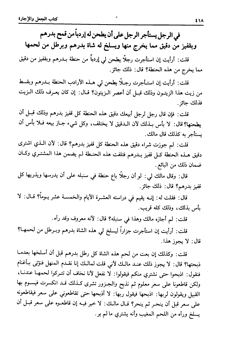 فِي الرَّجُلِ يَسْتَأْجِرُ الرَّجُلَ عَلَى أَنْ يَطْحَنَ لَهُ إرْدَبًّا مِنْ قَمْحٍ بِدِرْهَمٍ وَبِقَفِيزٍ مِنْ دَقِيقٍ مِمَّا يَخْرُجُ مِنْهَا وَيَسْلَخُ لَهُ شَاةً بِدِرْهَمٍ وَبِرِطْلٍ مِنْ لَحْمِهَا قُلْتُ: أَرَأَيْتَ إنْ اسْتَأْجَرْت رَجُلًا يَطْحَنُ لِي إرْدَبًّا مِنْ حِنْطَةٍ بِدِرْهَمٍ وَبِقَفِيزٍ مَنْ دَقِيقٍ مِمَّا يَخْرُجُ مِنْ هَذِهِ الْحِنْطَةِ؟ قَالَ: ذَلِكَ جَائِزٌ.
