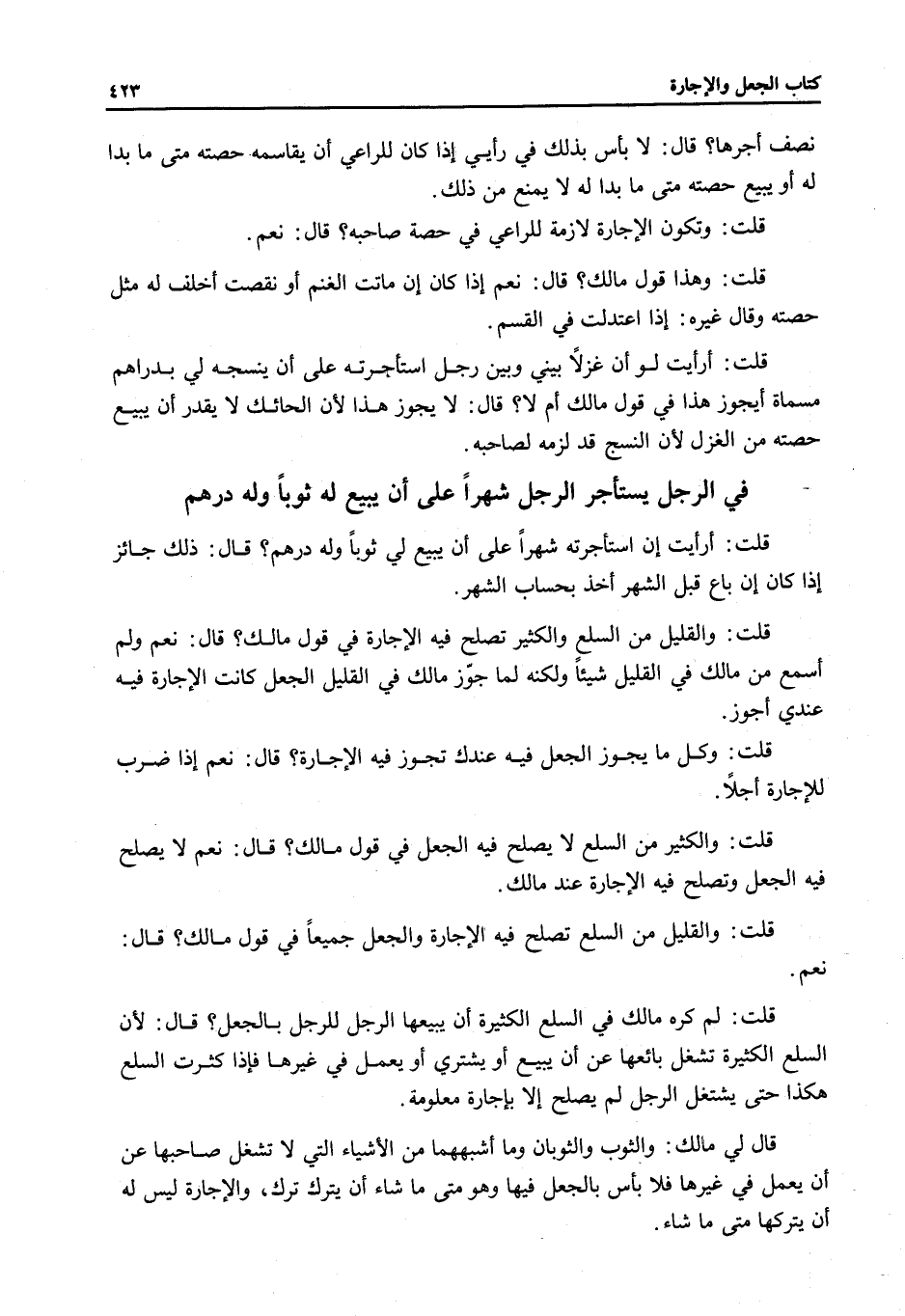 قُلْتُ: لِمَ كَرِهَ مَالِكٌ فِي السِّلَعِ الْكَثِيرَةِ أَنْ يَبِيعَهَا الرَّجُلُ لِلرَّجُلِ بِالْجُعْلِ؟ قَالَ: لِأَنَّ السِّلَعَ الْكَثِيرَةَ تَشْغَلُ بَائِعَهَا عَنْ أَنْ يَبِيعَ أَوْ يَشْتَرِيَ أَوْ يَعْمَلَ فِي غَيْرِهَا، فَإِذَا كَثُرَتْ السِّلَعُ هَكَذَا حَتَّى يَشْتَغِلَ الرَّجُلُ لَمْ يَصْلُحْ إلَّا بِإِجَارَةٍ مَعْلُومَةٍ. قَالَ لِي مَالِكٌ: وَالثَّوْبُ وَالثَّوْبَانِ وَمَا أَشْبَهَهُمَا مِنْ الْأَشْيَاءِ الَّتِي لَا تَشْغَلُ صَاحِبَهَا عَنْ أَنْ يَعْمَلَ فِي غَيْرِهَا، فَلَا بَأْسَ بِالْجُعْلِ فِيهَا وَهُوَ مَتَى مَا شَاءَ أَنْ يَتْرُكَ تَرَكَ، وَالْإِجَارَةُ لَيْسَ لَهُ أَنْ يَتْرُكَهَا مَتَى مَا شَاءَ.