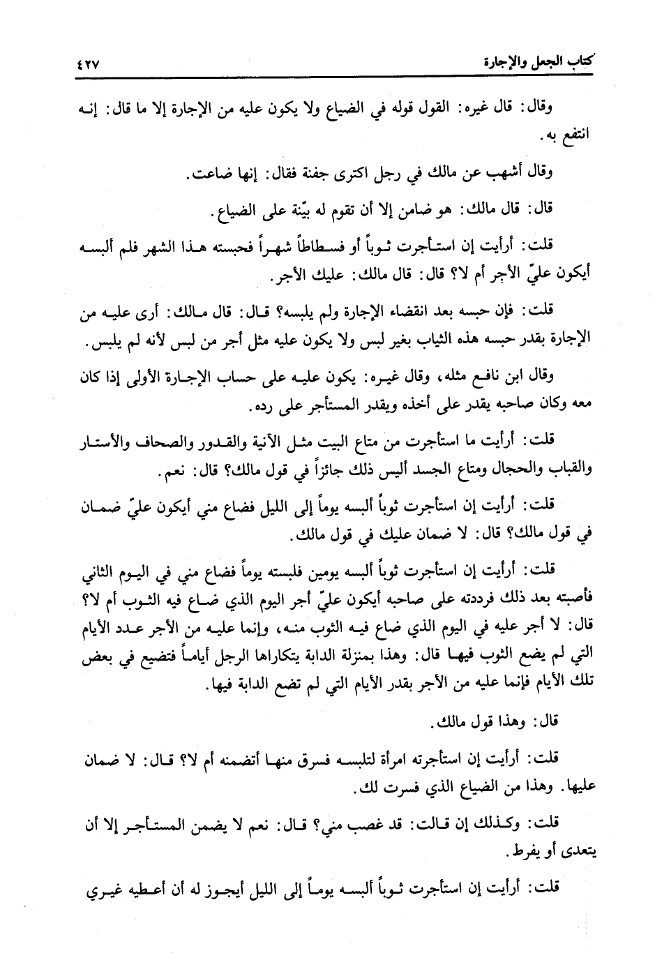 قُلْتُ: أَرَأَيْتَ إنْ اسْتَأْجَرْت ثَوْبًا أَلْبَسُهُ يَوْمًا إلَى اللَّيْلِ فَضَاعَ مِنِّي أَيَكُونُ عَلَيَّ ضَمَانٌ فِي قَوْلِ مَالِكٍ؟ قَالَ: لَا ضَمَانَ عَلَيْكَ فِي قَوْلِ مَالِكٍ.
