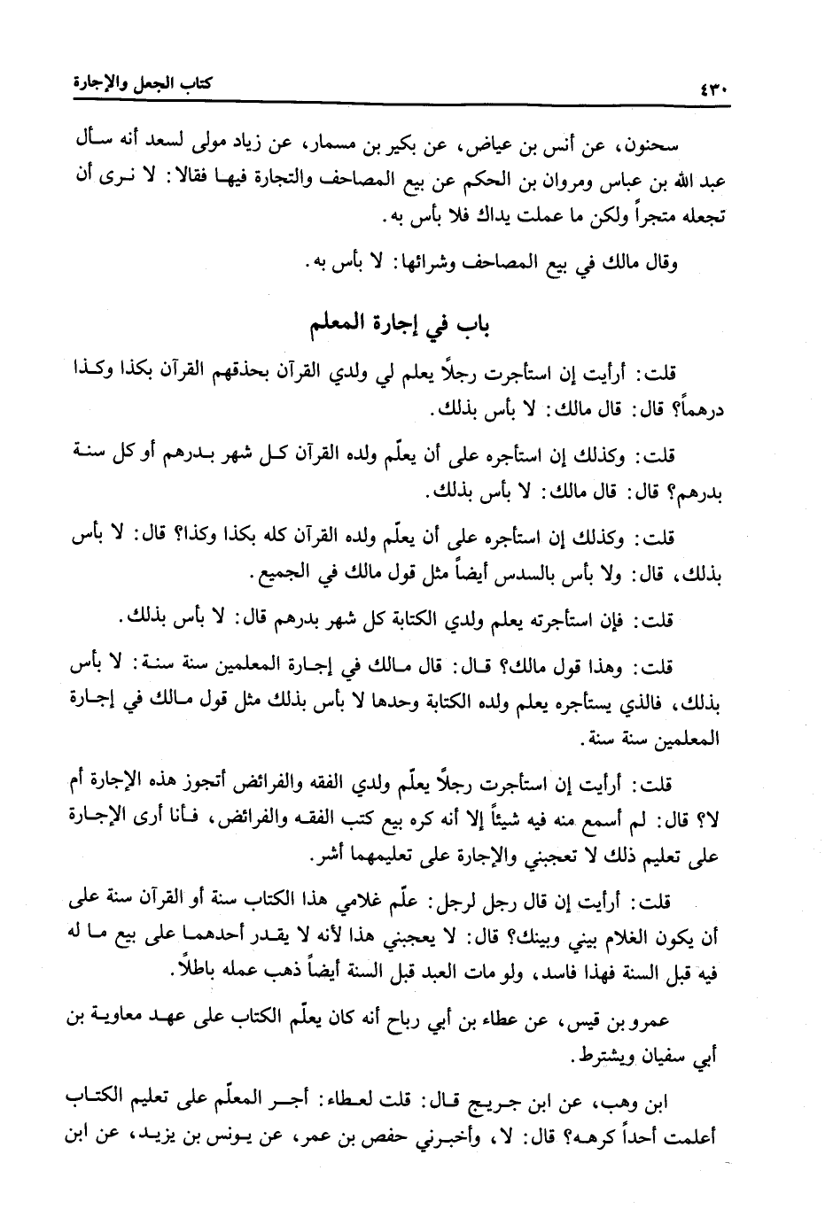 قُلْتُ: أَرَأَيْتَ إنْ قَالَ رَجُلٌ لِرَجُلٍ عَلِّمْ غُلَامِي هَذَا الْكِتَابَ سَنَةً أَوْ الْقُرْآنَ سَنَةً عَلَى أَنْ يَكُونَ الْغُلَامُ بَيْنِي وَبَيْنَك؟ قَالَ لَا يُعْجِبُنِي هَذَا؛ لِأَنَّهُ لَا يَقْدِرُ أَحَدُهُمَا عَلَى بَيْعِ مَا لَهُ فِيهِ قَبْلَ السَّنَةِ؛ فَهَذَا فَاسِدٌ، وَلَوْ مَاتَ الْعَبْدُ قَبْلَ السَّنَةِ أَيْضًا ذَهَبَ عَمَلُهُ بَاطِلًا. عَمْرُو بْنُ قَيْسٍ عَنْ عَطَاءِ بْنِ أَبِي رَبَاحٍ أَنَّهُ كَانَ يُعَلِّمُ الْكِتَابَ عَلَى عَهْدِ مُعَاوِيَةَ بْنِ أَبِي سُفْيَانَ وَيَشْتَرِطُ. ابْنُ وَهْبٍ عَنْ ابْنِ جُرَيْجٍ قَالَ: قُلْتُ لِعَطَاءٍ: أَجْرُ الْمُعَلِّمِ عَلَى تَعْلِيمِ الْكِتَابِ أَعَلِمْتَ أَحَدًا كَرِهَهُ قَالَ لَا وَأَخْبَرَنِي حَفْصُ بْنُ عُمَرَ عَنْ يُونُسَ بْنِ يَزِيدَ عَنْ ابْنِ