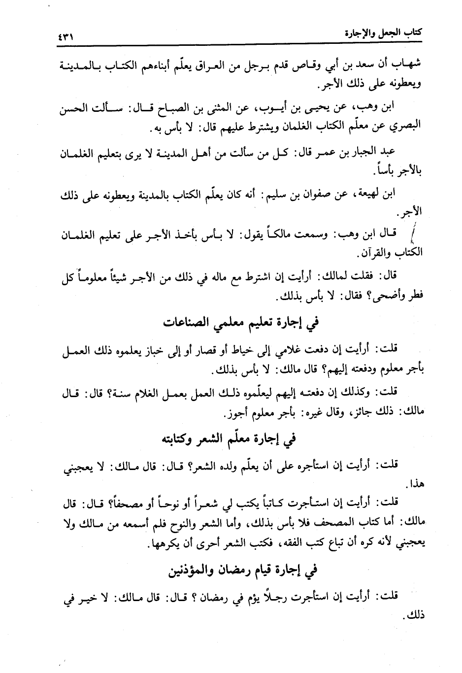 شِهَابٍ أَنَّ سَعْدَ بْنَ أَبِي وَقَّاصٍ قَدِمَ بِرَجُلٍ مِنْ الْعِرَاقِ يُعَلِّمُ أَبْنَاءَهُمْ الْكِتَابَ بِالْمَدِينَةِ وَيُعْطُونَهُ عَلَى ذَلِكَ الْأَجْرَ. ابْنُ وَهْبٍ، عَنْ يَحْيَى بْنِ أَيُّوبَ، عَنْ الْمُثَنَّى بْنِ الصَّبَّاحِ قَالَ: سَأَلْتُ الْحَسَنَ الْبَصْرِيَّ عَنْ مُعَلِّمِ الْكِتَابِ الْغِلْمَانَ وَيَشْتَرِطُ عَلَيْهِمْ؟