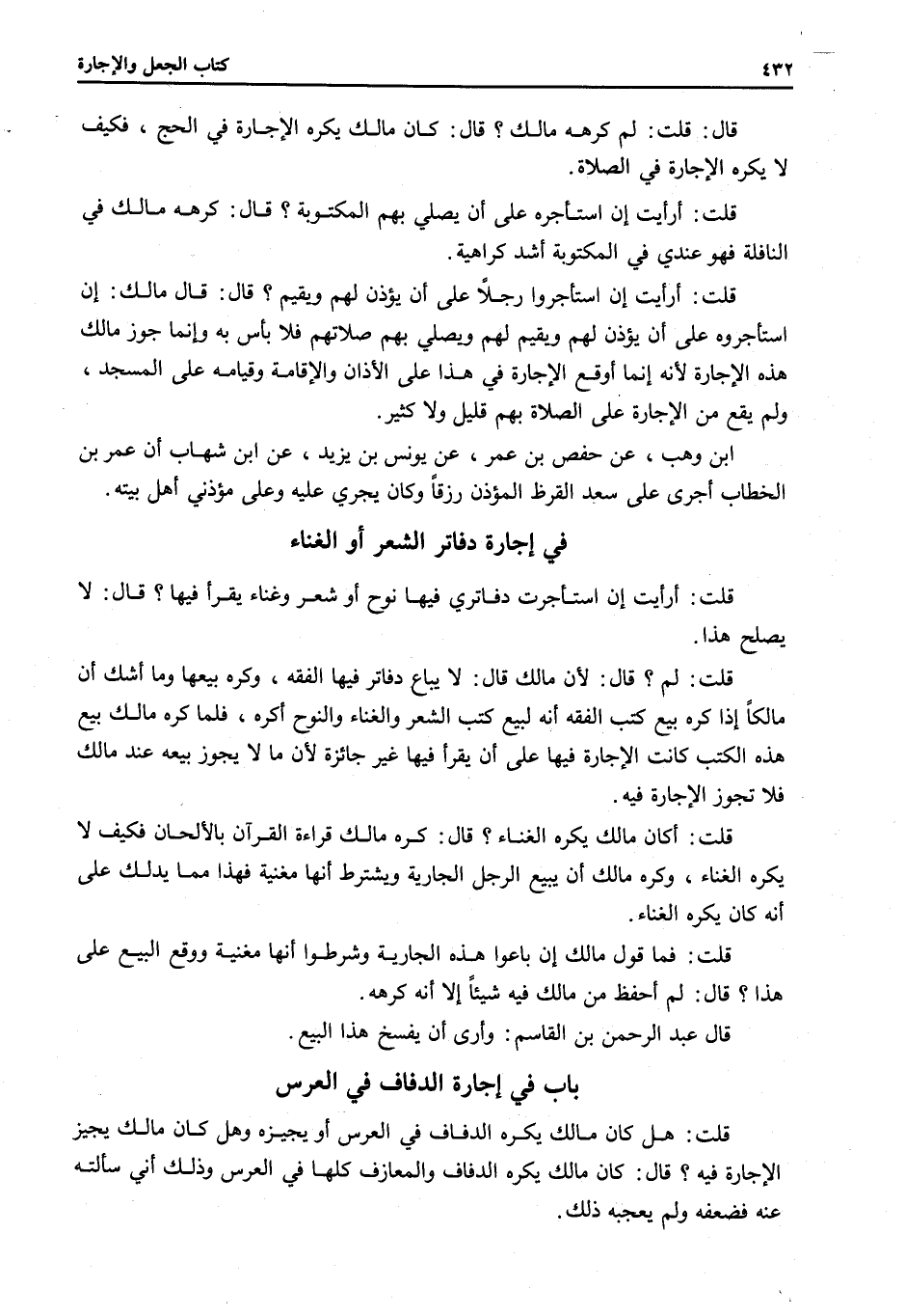 قُلْتُ: هَلْ كَانَ مَالِكٌ يَكْرَهُ الدِّفَافَ فِي الْعُرْسِ أَوْ يُجِيزُهُ وَهَلْ كَانَ مَالِكٌ يُجِيزُ الْإِجَارَةَ فِيهِ؟ قَالَ: كَانَ مَالِكٌ يَكْرَهُ الدِّفَافَ وَالْمَعَازِفَ كُلَّهَا فِي الْعُرْسِ وَذَلِكَ أَنِّي سَأَلْتُهُ عَنْهُ فَضَعَّفَهُ وَلَمْ يُعْجِبْهُ ذَلِكَ.