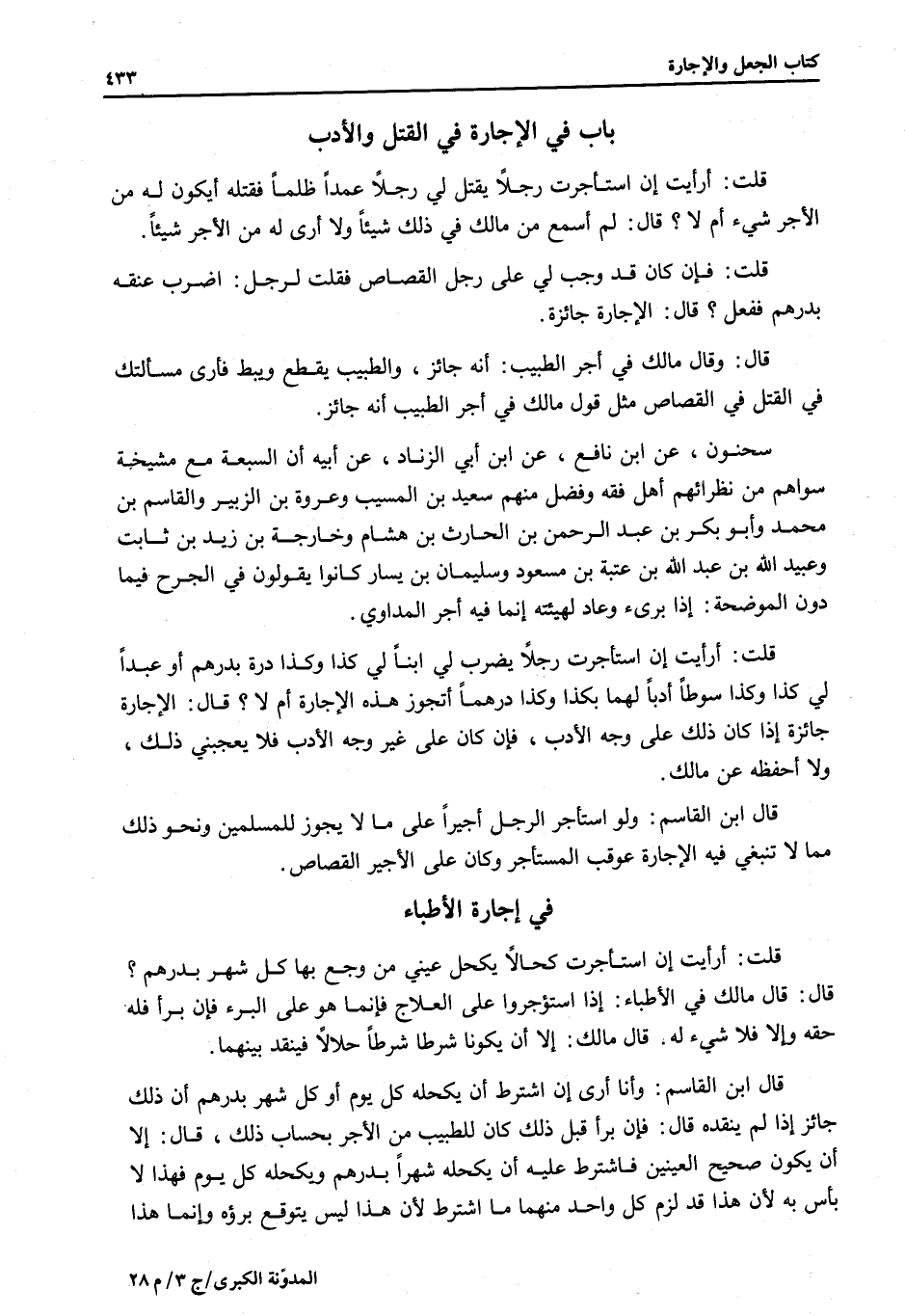 قَالَ: وَقَالَ مَالِكٌ: فِي أَجْرِ الطَّبِيبِ أَنَّهُ جَائِزٌ وَالطَّبِيبُ يَقْطَعُ وَيَبُطُّ فَأَرَى مَسْأَلَتَكَ فِي الْقَتْلِ فِي الْقِصَاصِ مِثْلَ قَوْلِ مَالِكٍ فِي أَجْرِ الطَّبِيبِ أَنَّهُ جَائِزٌ سَحْنُونٌ، عَنْ ابْنِ نَافِعٍ، عَنْ ابْنِ أَبِي الزِّنَادِ، عَنْ أَبِيهِ أَنَّ السَّبْعَةَ مَعَ مَشْيَخَةٍ سِوَاهُمْ مِنْ نُظَرَائِهِمْ أَهْلُ فِقْهٍ وَفَضْلٍ مِنْهُمْ سَعِيدُ بْنُ الْمُسَيِّبِ وَعُرْوَةُ بْنُ الزُّبَيْرِ وَالْقَاسِمُ بْنُ مُحَمَّدٍ وَأَبُو بَكْرِ بْنُ عَبْدِ الرَّحْمَنِ بْنِ الْحَارِثِ بْنِ هِشَامٍ وَخَارِجَةُ بْنُ زَيْدِ بْنِ ثَابِتٍ وَعُبَيْدُ اللَّهِ بْنُ عَبْدِ اللَّهِ بْنِ عُتْبَةَ بْنِ مَسْعُودٍ وَسُلَيْمَانُ بْنُ يَسَارٍ كَانُوا يَقُولُونَ فِي الْجُرْحِ فِيمَا دُونَ الْمُوَضَّحَةِ: إذَا بَرِئَ وَعَادَ لِهَيْئَتِهِ إنَّمَا فِيهِ أَجْرُ الْمُدَاوِي.