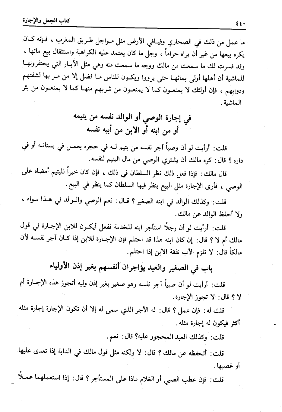 ِ قُلْتُ: أَرَأَيْتَ لَوْ أَنَّ صَبِيًّا آجَرَ نَفْسَهُ وَهُوَ صَغِيرٌ بِغَيْرِ إذْنِ وَلِيِّهِ أَتَجُوزُ هَذِهِ الْإِجَارَةُ أَمْ لَا؟ قَالَ: لَا تَجُوزُ الْإِجَارَةُ.