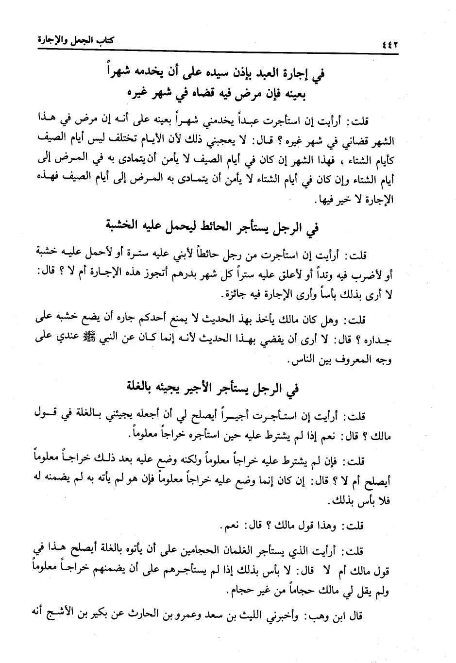 قُلْتُ: وَهَلْ كَانَ مَالِكٌ يَأْخُذُ بِهَذَا الْحَدِيثِ «لَا يَمْنَعْ أَحَدُكُمْ جَارَهُ أَنْ يَضَعَ خَشَبَهُ عَلَى جِدَارِهِ؟» قَالَ: لَا أَرَى أَنْ يَقْضِيَ بِهَذَا الْحَدِيثِ؛ لِأَنَّهُ إنَّمَا كَانَ عَنْ النَّبِيِّ - صَلَّى اللَّهُ عَلَيْهِ وَسَلَّمَ - عِنْدِي عَلَى وَجْهِ الْمَعْرُوفِ بَيْنَ النَّاسِ.