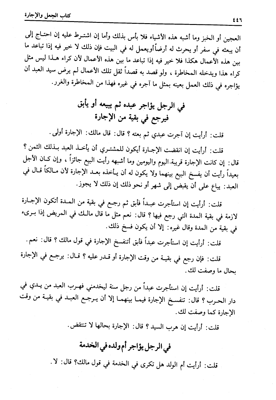 فِي الرَّجُلِ يُؤَاجِرُ عَبْدَهُ، ثُمَّ يَبِيعُهُ أَوْ يَأْبَقُ فَيَرْجِعَ فِي بَقِيَّةٍ مِنْ الْإِجَارَةِ قُلْتُ: أَرَأَيْتَ إنْ آجَرْت عَبْدِي، ثُمَّ بِعْتُهُ؟ قَالَ: قَالَ مَالِكٌ: الْإِجَارَةُ أَوْلَى.