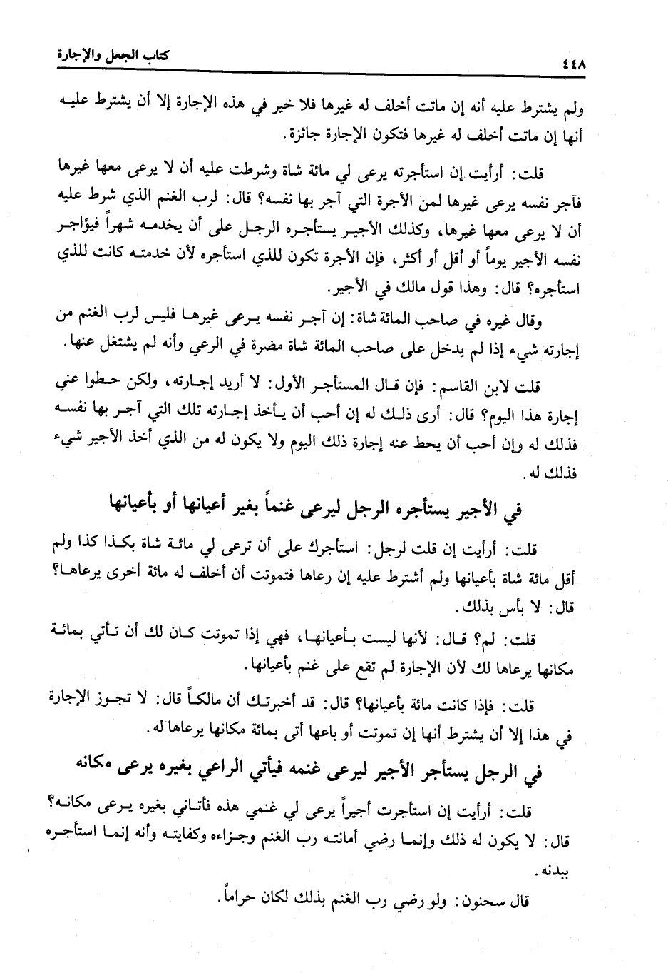 فِي الرَّجُلِ يَسْتَأْجِرُ الْأَجِيرَ لِيَرْعَى غَنَمَهُ فَيَأْتِي الرَّاعِي بِغَيْرِهِ يَرْعَى مَكَانَهُ قُلْتُ: أَرَأَيْتَ إنْ اسْتَأْجَرْت أَجِيرًا يَرْعَى لِي غَنَمِي هَذِهِ فَأَتَانِي بِغَيْرِهِ يَرْعَى مَكَانَهُ؟ قَالَ: لَا يَكُونُ لَهُ ذَلِكَ وَإِنَّمَا رَضِيَ أَمَانَتَهُ رَبُّ الْغَنَمِ وَجَزَاءَهُ وَكِفَايَتَهُ وَأَنَّهُ إنَّمَا اسْتَأْجَرَهُ بِبَدَنِهِ.