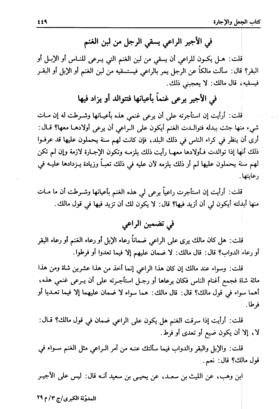 فِي الْأَجِيرِ يَرْعَى غَنَمًا بِأَعْيَانِهَا فَتَتَوَالَدُ أَوْ يُزَادُ فِيهَا قُلْتُ: أَرَأَيْتَ إنْ اسْتَأْجَرْته عَلَى أَنْ يَرْعَى غَنَمِي هَذِهِ بِأَعْيَانِهَا وَشَرَطْت لَهُ إنْ مَاتَ شَيْءٌ مِنْهَا جِئْت بِبَدَلِهِ فَتَوَالَدَتْ الْغَنَمُ أَيَكُونُ عَلَى الرَّاعِي أَنْ يَرْعَى أَوْلَادَهَا مَعَهَا؟ قَالَ: أَرَى أَنْ يَنْظُرَ فِي كِرَاءِ النَّاسِ فِي ذَلِكَ الْبَلَدِ، فَإِنْ كَانَتْ لَهُمْ سُنَّةٌ يَحْمِلُونَ عَلَيْهَا قَدْ عَرَفُوا ذَلِكَ أَنَّهَا إذَا تَوَالَدَتْ فَأَوْلَادُهَا مَعَهَا رَأَيْتُ ذَلِكَ يَلْزَمُهُ وَتَكُونُ الْإِجَارَةُ لَازِمَةً وَإِنْ لَمْ تَكُنْ لَهُمْ سُنَّةٌ يَحْمِلُونَ عَلَيْهَا لَمْ أَرَ ذَلِكَ يَلْزَمُهُ؛ لِأَنَّ عَلَيْهِ فِي ذَلِكَ تَعَبًا وَزِيَادَةً يَزْدَادَهَا عَلَيْهِ فِي رِعَايَتِهَا.